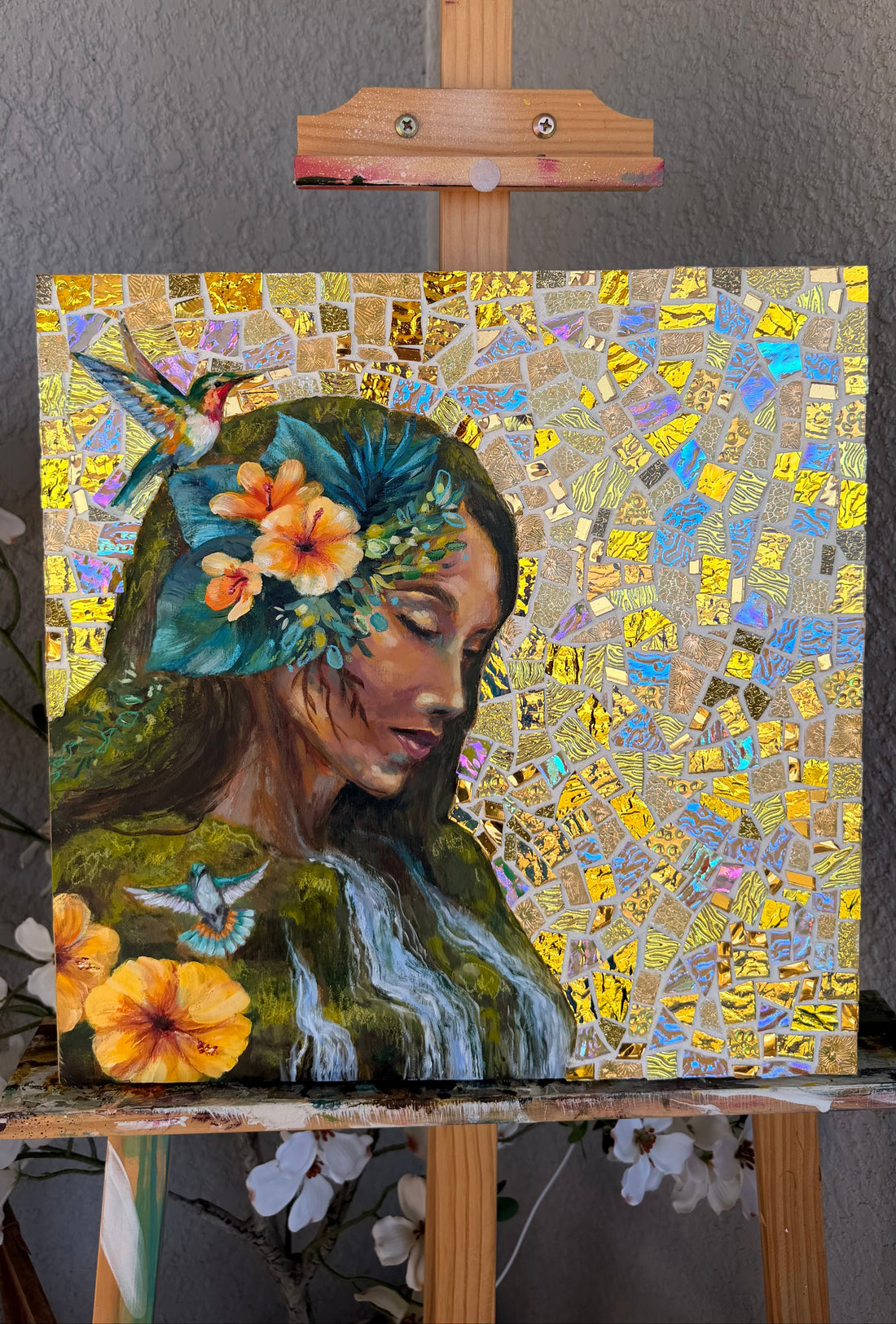 Female empowerment, nature, and intuition are big themes for each of my paintings. If I had to sum up my art style it would be: expressive nature inspired portraits with bold color style and loose brushwork guided by intuition and curiosity.