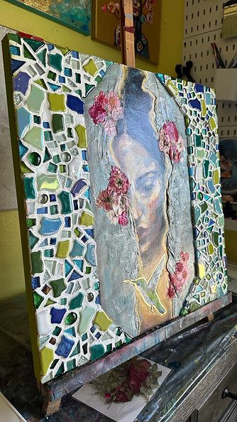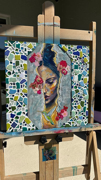 This piece is hand painted with Highest Quality Acrylic Golden and Liquitex Paints, glass mosaic, and real pressed flowers. Wood framed back and ready to hang on your wall. All originals are sealed with varnish to protect the life of the painting. Ships in packaged box bubble wrap and comes with a certificate of authenticity, Handwritten letter from artist, and free stickers. We also offer fast shipping via USPS. Women Owned Business. Made in the USA.