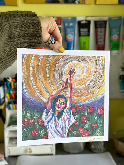This gorgeous 8x8 one of a kind collectable archival fine art print is signed by emerging artist Michelle Green, owner of Mozzafiato Art. 100% Secured Purchases guaranteed. Ships in packaged sealed envelope bubble wrapped and comes with a certificate of authenticity and free stickers. We also offer fast shipping via USPS. Women Owned Business. Made in the USA. Looks beautiful in any style frame that you choose!