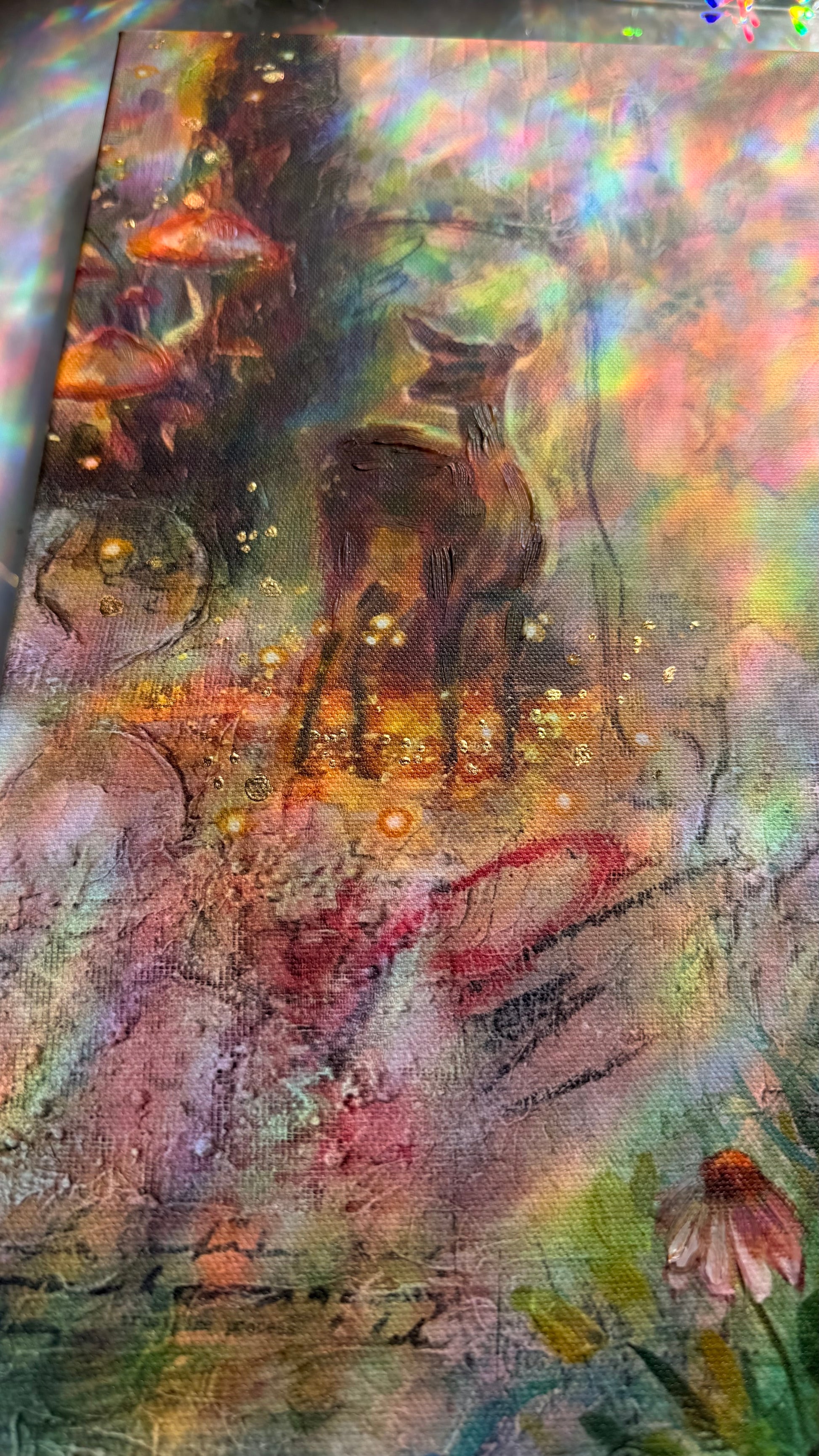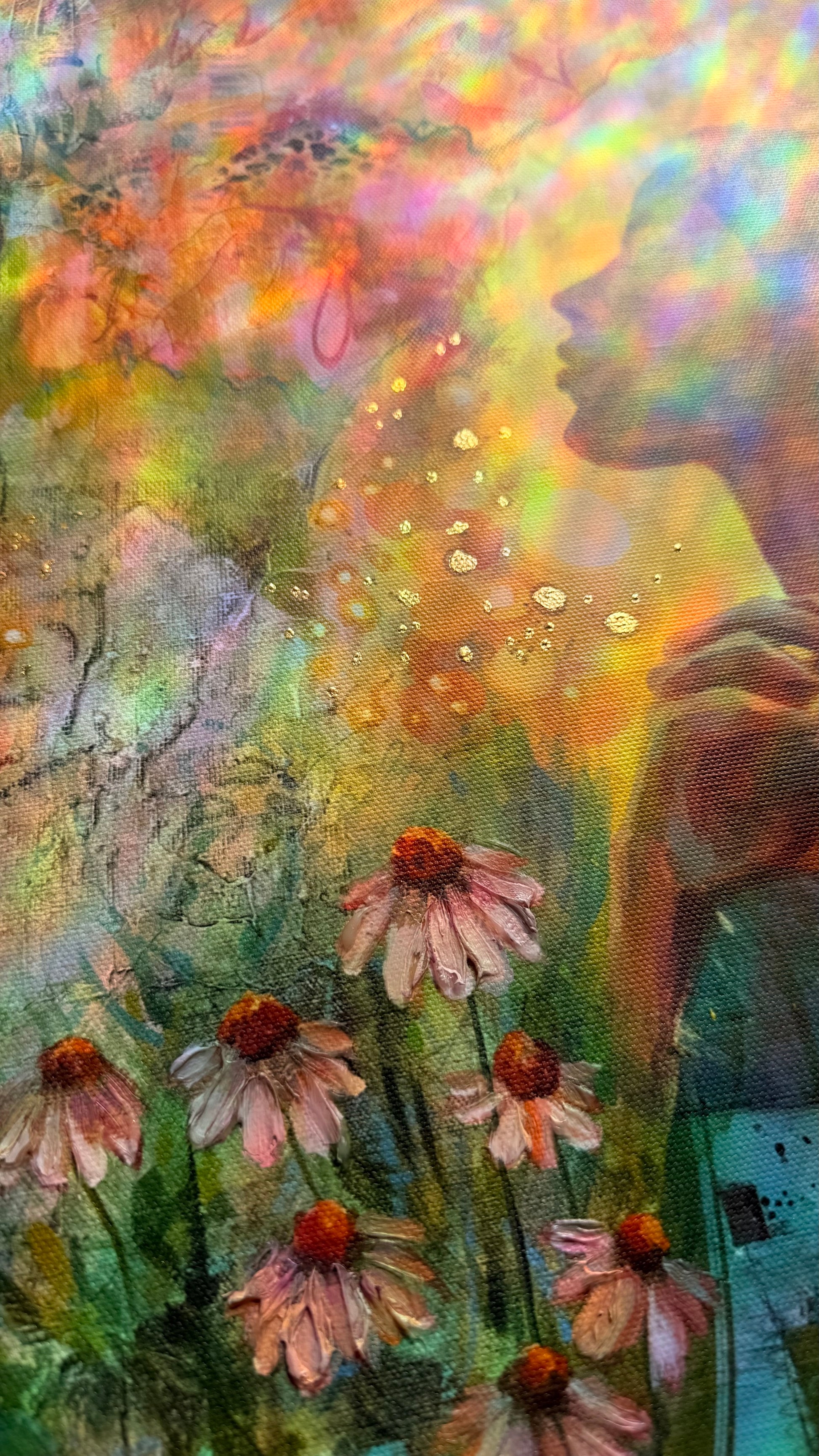 Each piece is a museum quality giclée, personally hand embellished with selective texture and real 24K gold leaf, adding dimension, light, and a sense of presence that shifts as you move around it. No two are exactly alike.
