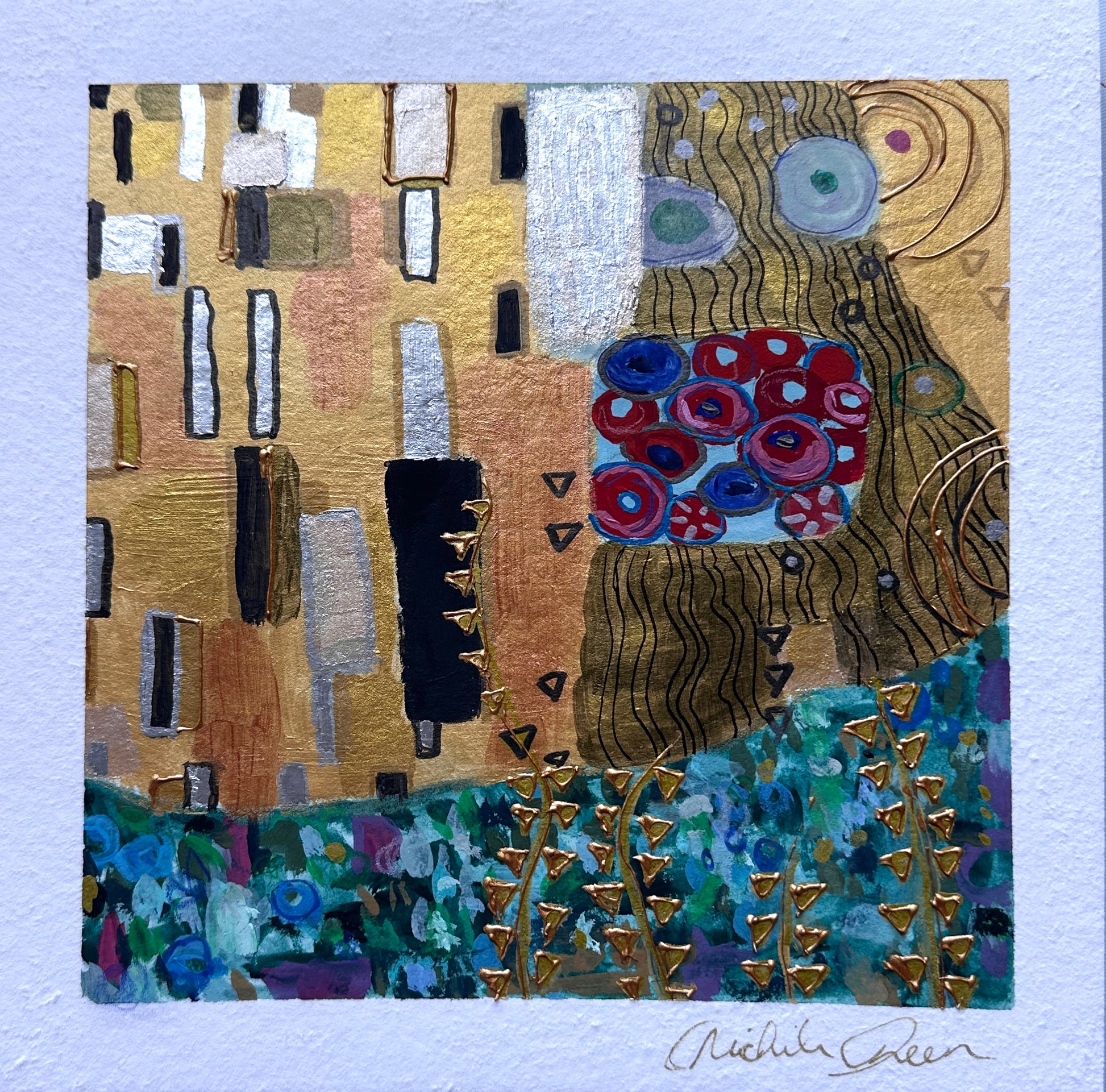 Gustav Klimt Study on 8x8 100% thick archival cotton paper. Acrylic metallic paints, marker, and gold inks.