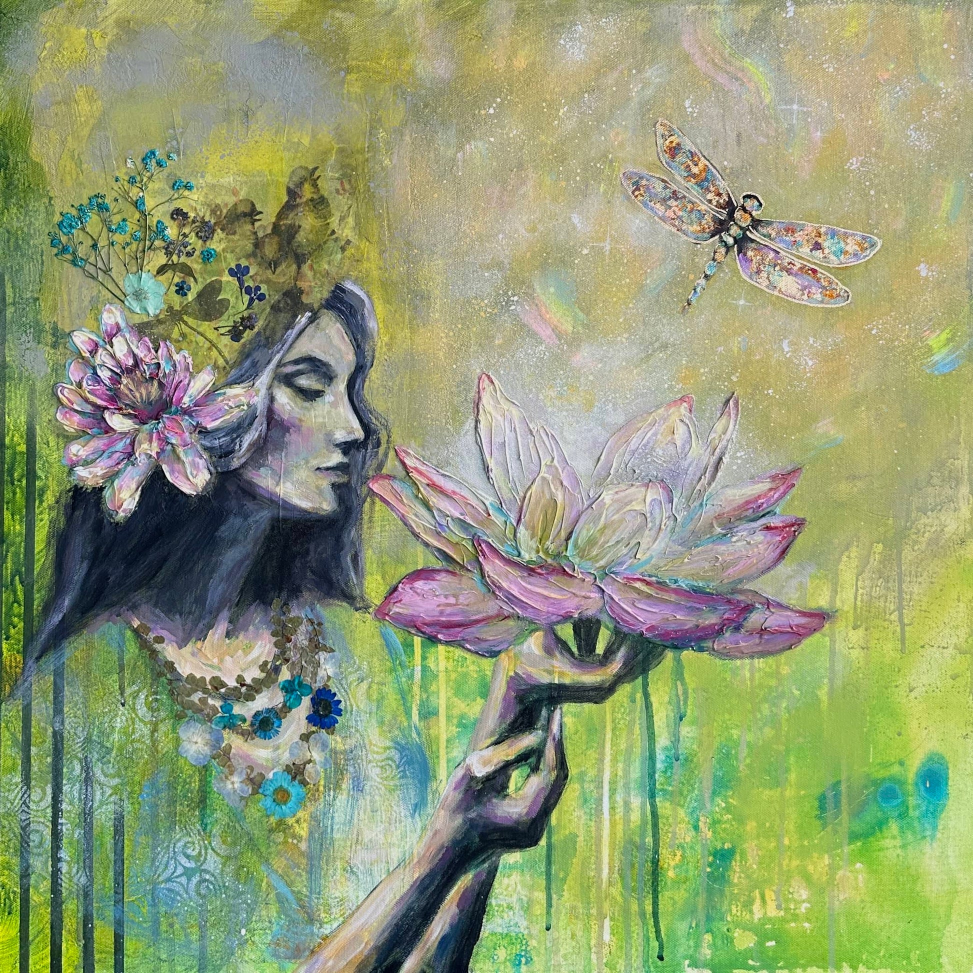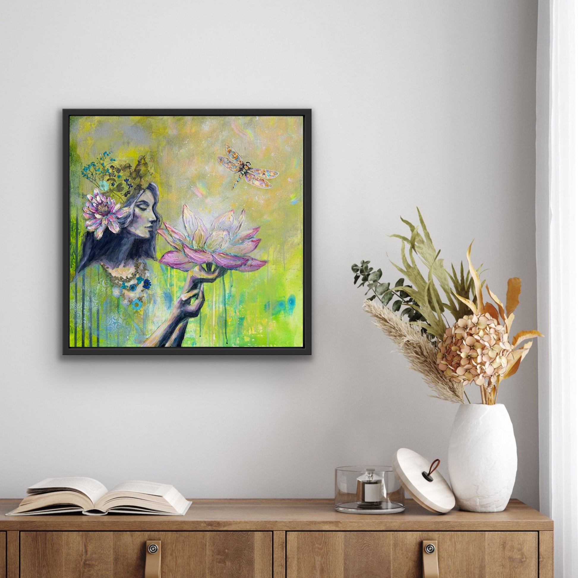 This gorgeous one of a kind collectable Canvas Print is signed by emerging artist Michelle Green. You have the option of getting your canvas print embellished in gold and thick texture. 100% Secured Purchases guaranteed. Ships in packaged sealed envelope bubble wrapped and comes with a free sticker. We also offer fast shipping via USPS. Women Owned Business. Made in the USA. Looks beautiful on any wall and ready to hang with a sawtooth hanger already installed. Each print is varnished to protect the life of the painting, signed, and stamped with a certificate of authenticity.