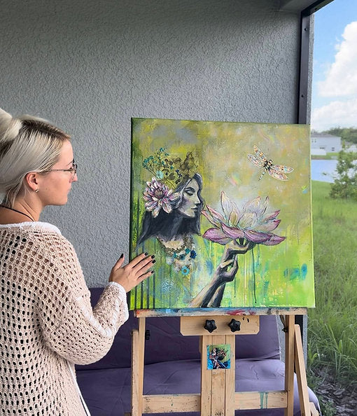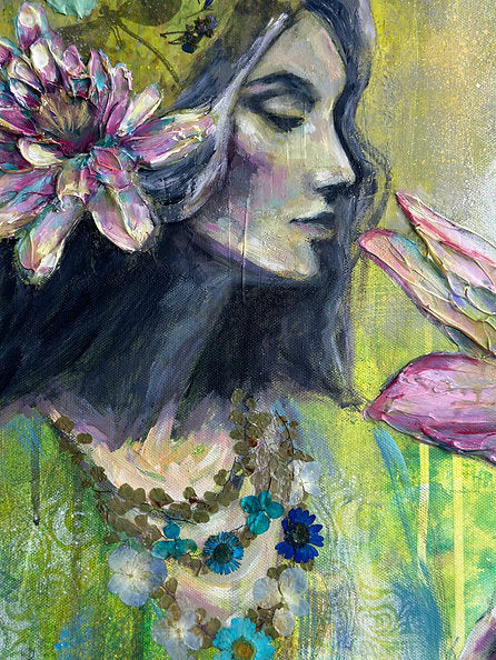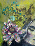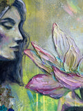 This piece is hand painted with Highest Quality Acrylic Golden and Liquitex Paints, Gold Leaf, Back-stapled with a wood framed back and ready to hang on your wall. All originals are sealed with varnish to protect the life of the painting. Ships in packaged box bubble wrap and comes with a certificate of authenticity, Handwritten letter from artist, and free stickers. We also offer fast shipping via USPS. Women Owned Business. Made in the USA.