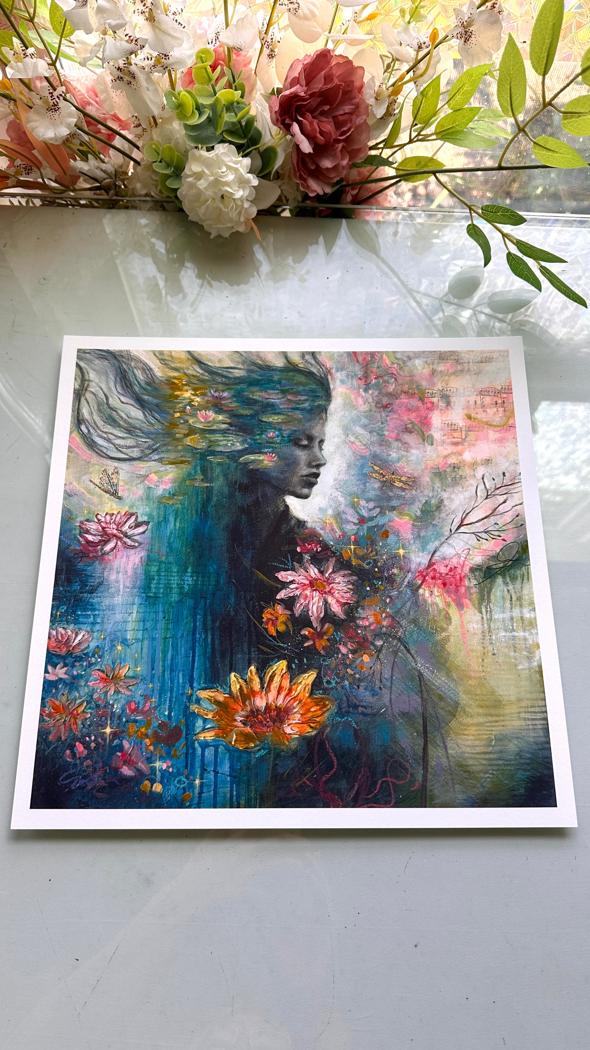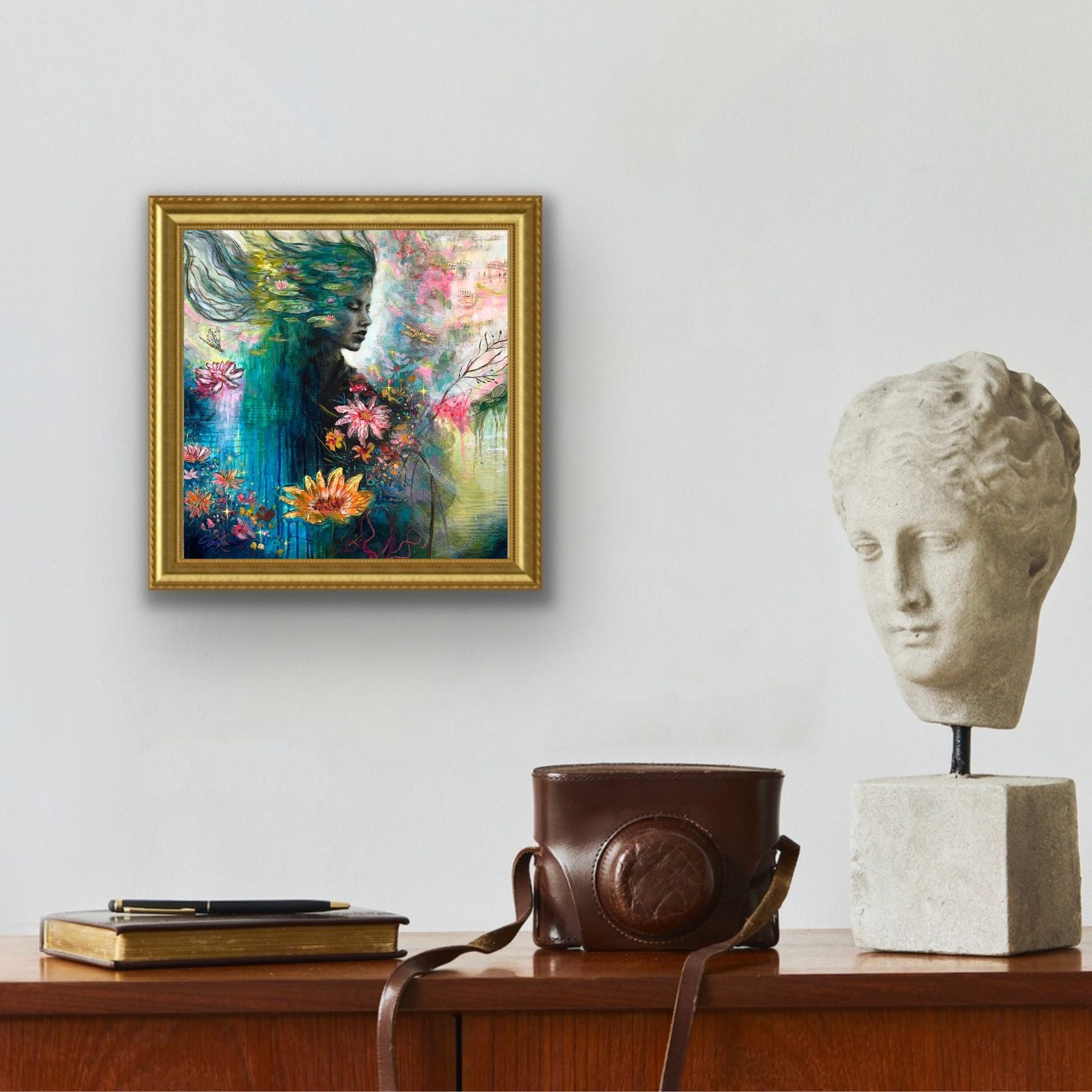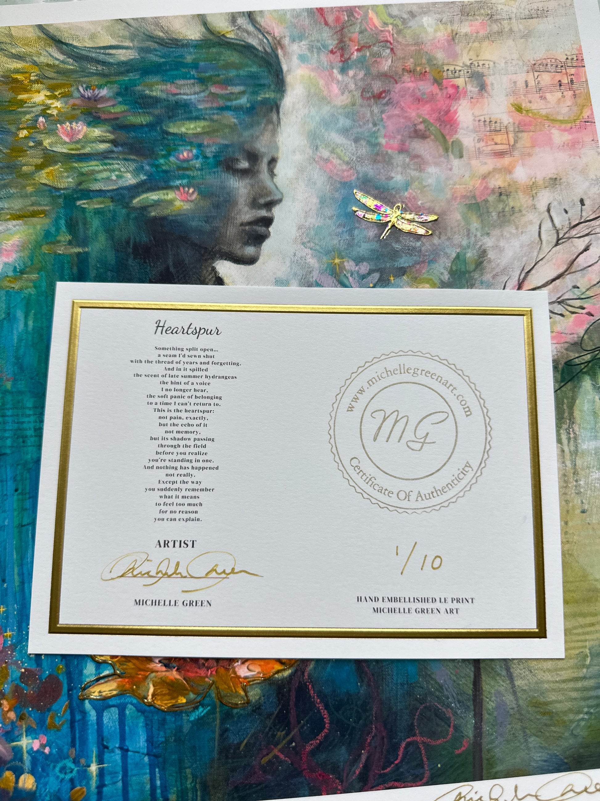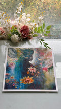 This gorgeous 12x12 one of a kind collectable Archival fine art print is embellished in gold leaf, signed, numbered, and stamped by emerging artist Michelle Green. Printed on heavy 100% Acid Free cotton rag paper. Printed from my in house fine art archival Giclee printer. Signed and numbered in-studio, colors settling into the fibers in a way that feels not unlike magic. Your artwork will arrive beautifully packaged and ready to be framed (Or you can purchase a frame from me!), along with a Certificate of Authenticity (poetry included), proving your limited edition print’s origin, quality, and value. Only 10 will ever be made! 100% Secured Purchases guaranteed. Carefully packaged to protect the print. We also offer fast shipping via USPS. Women Owned Business. Made in the USA. Looks beautiful in any style frame that you choose!