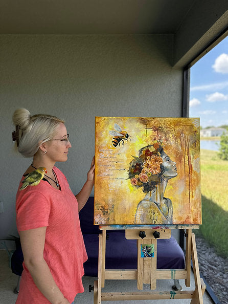 This gorgeous original is a one of a kind collectable. "Honey For Two" is an acrylic mixed media painting on 24x24 canvas and is signed and stamped by emerging artist Michelle Green, owner of Mozzafiato Art. 100% Secured Purchases guaranteed.