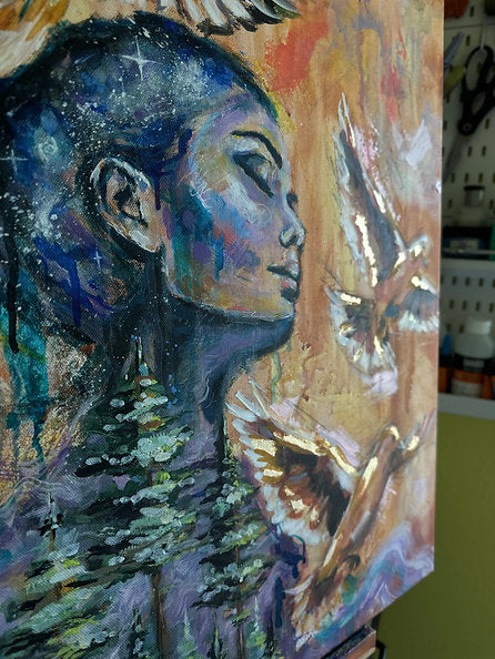 This piece is hand painted with Highest Quality Acrylic Golden and Liquitex Paints and gold leaf. Back-stapled with a wood framed back and ready to hang on your wall. All originals are sealed with varnish to protect the life of the painting. Ships in packaged box bubble wrap and comes with a certificate of authenticity, Handwritten letter from artist, and free stickers. We also offer fast shipping via UPS. Women Owned Business. Made in the USA.