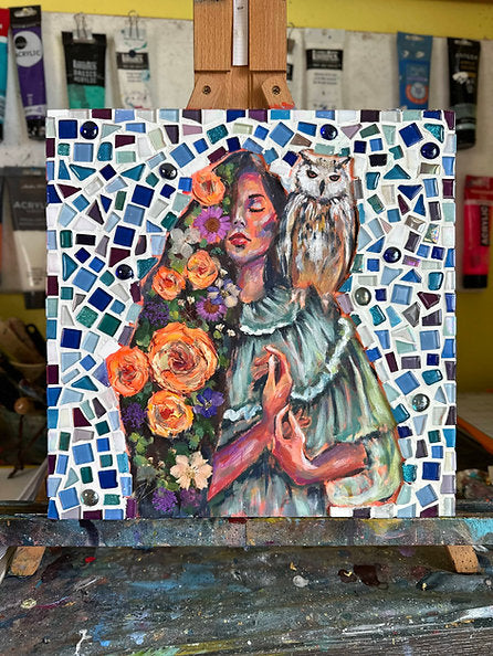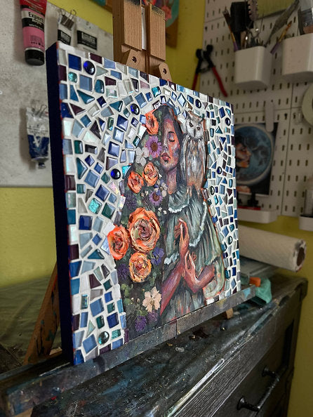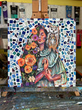 This piece is hand painted with Highest Quality Acrylic Golden and Liquitex Paints, real pressed flowers, and glass mosaic pieces. Wood framed back and ready to hang on your wall. All originals are sealed with varnish to protect the life of the painting. Ships in packaged box bubble wrap and comes with a certificate of authenticity, Handwritten letter from artist, and free stickers. We also offer fast shipping via USPS. Women Owned Business. Made in the USA.