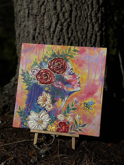 This gorgeous one of a kind collectable Canvas Print is signed by emerging artist Michelle Green. You have the option of getting your canvas print embellished in gold and thick texture. 100% Secured Purchases guaranteed. Ships in packaged sealed envelope bubble wrapped and comes with a free sticker. We also offer fast shipping via USPS. Women Owned Business. Made in the USA. Looks beautiful on any wall and ready to hang with a sawtooth hanger already installed. Each print is varnished to protect the life of the painting, signed, and stamped with a certificate of authenticity.