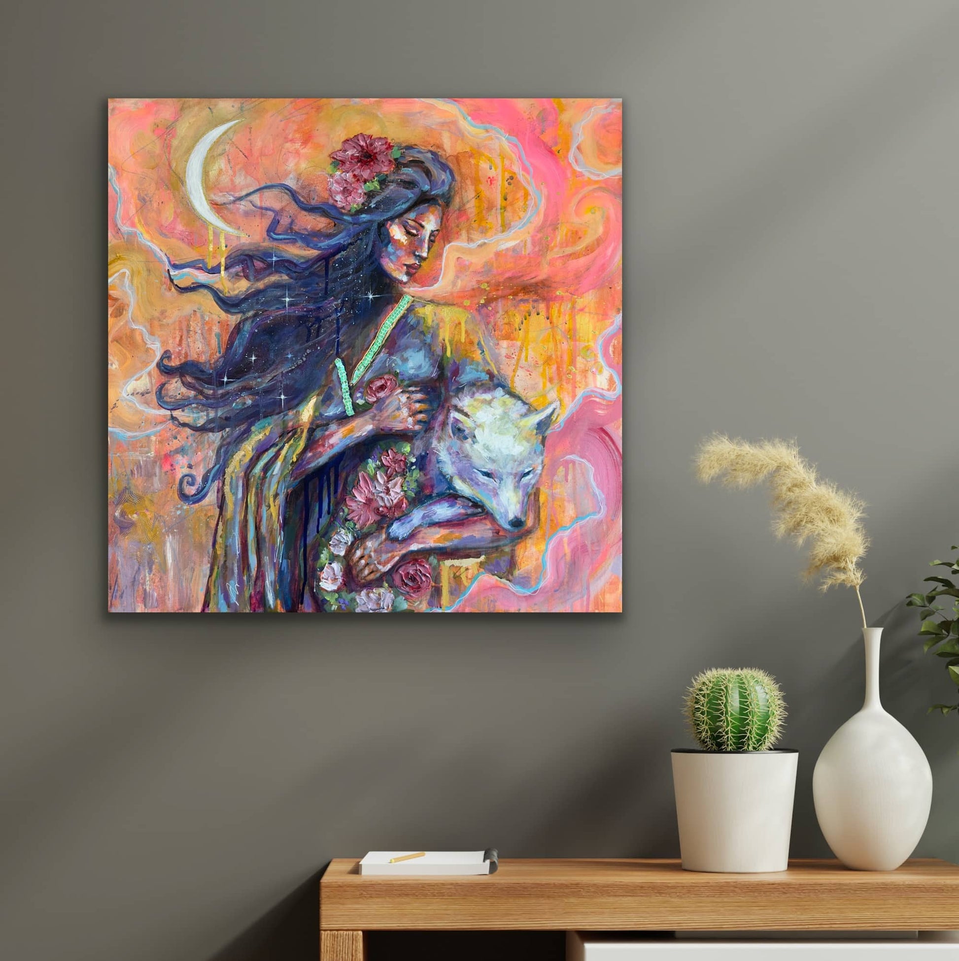 This gorgeous one of a kind collectable Hand Embellished Canvas Print is signed by emerging artist Michelle Green. Each piece is made with 100% cotton and is hand stretched. She is hand embellished in gold and thick texture. 100% Secured Purchases guaranteed. Ships in packaged sealed envelope bubble wrapped and comes with a free sticker. We also offer fast shipping via USPS. Women Owned Business. Made in the USA. Looks beautiful on any wall and ready to hang with a sawtooth hanger already installed. Each print is varnished to protect the life of the painting, signed, and stamped with a certificate of authenticity.