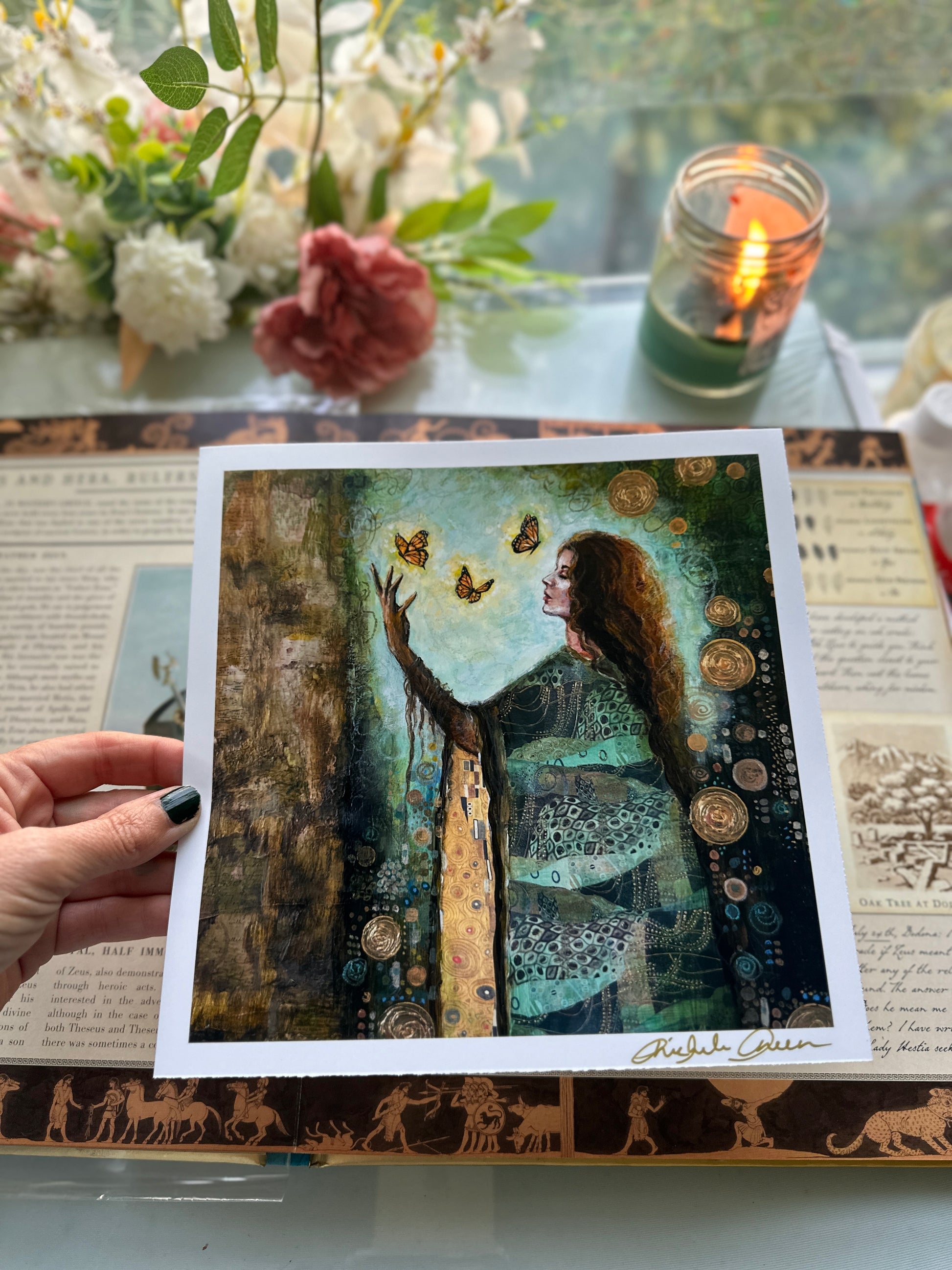 This gorgeous 8x8 one of a kind collectable archival fine art print is signed by emerging artist Michelle Green. 100% Secured Purchases guaranteed. Ships in packaged sealed envelope, bubble wrapped, and comes with a free sticker. We also offer fast shipping via USPS. Women Owned Business. Made in the USA. Looks beautiful in any style frame that you choose!