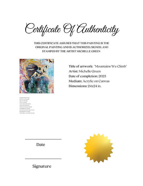 This gorgeous original is a one of a kind collectable. "Mountains We Climb" is an acrylic painting on 24x24 canvas and is signed and stamped by emerging artist Michelle Green, owner of Mozzafiato Art. 100% Secured Purchases guaranteed.