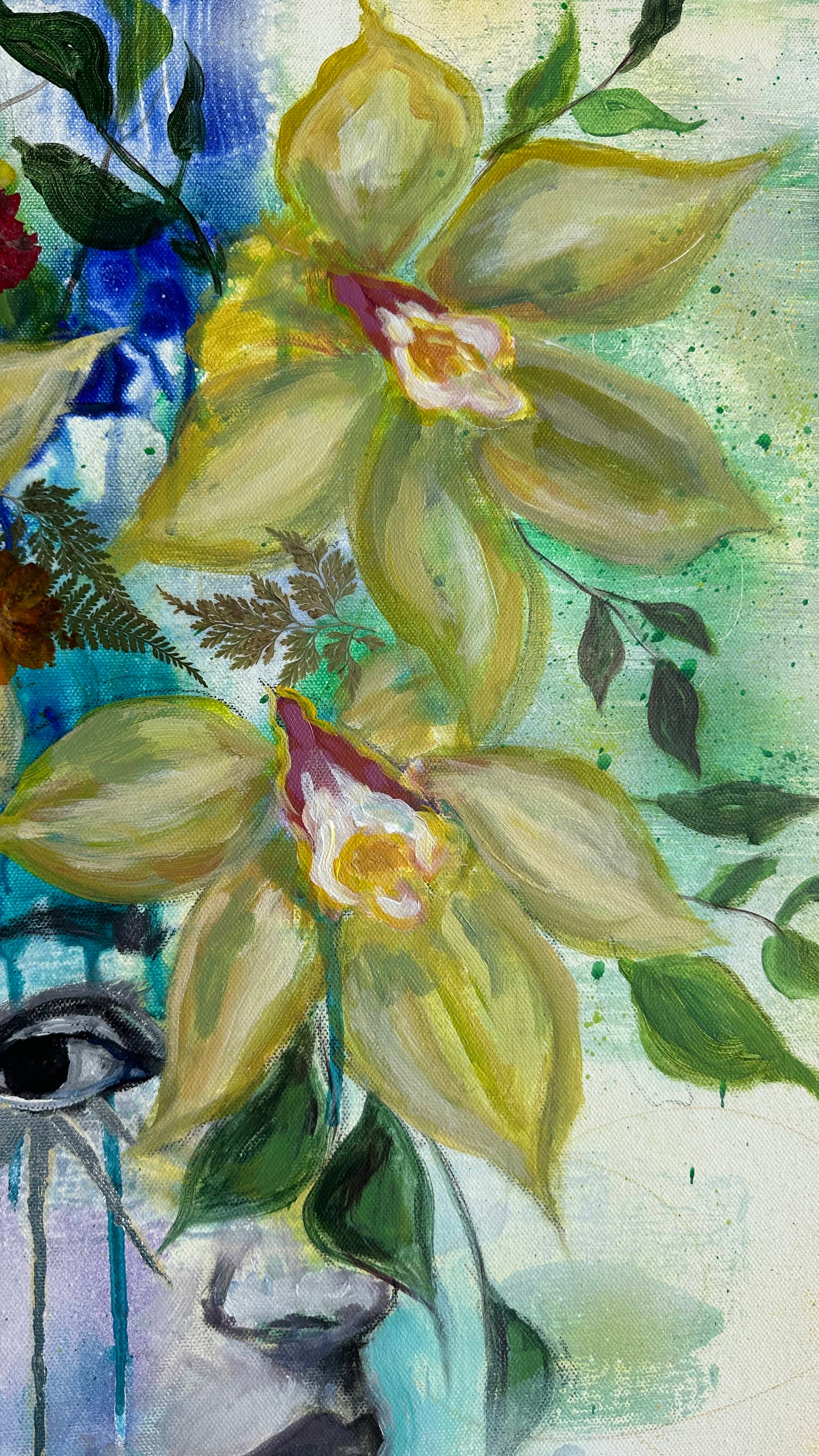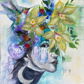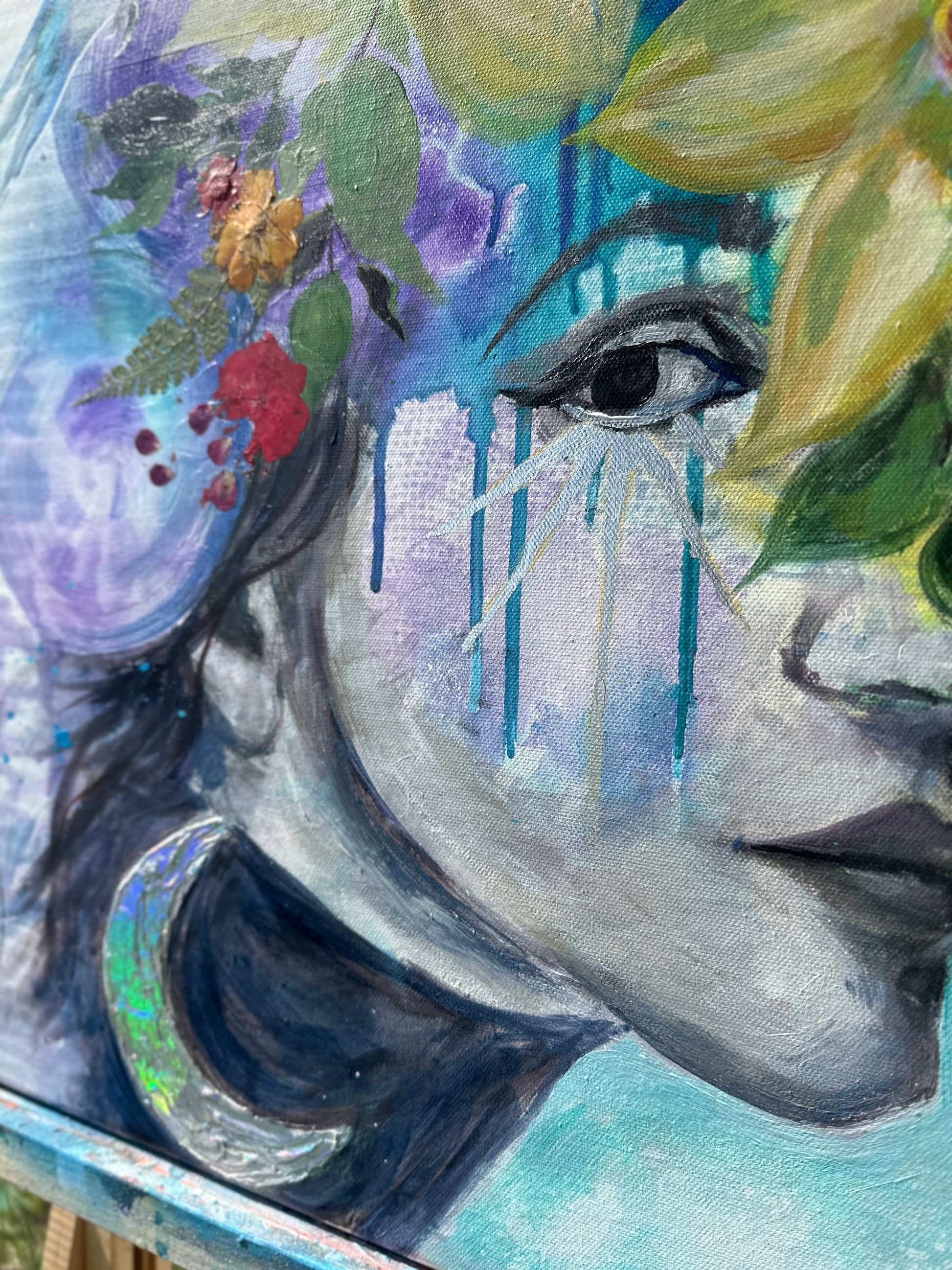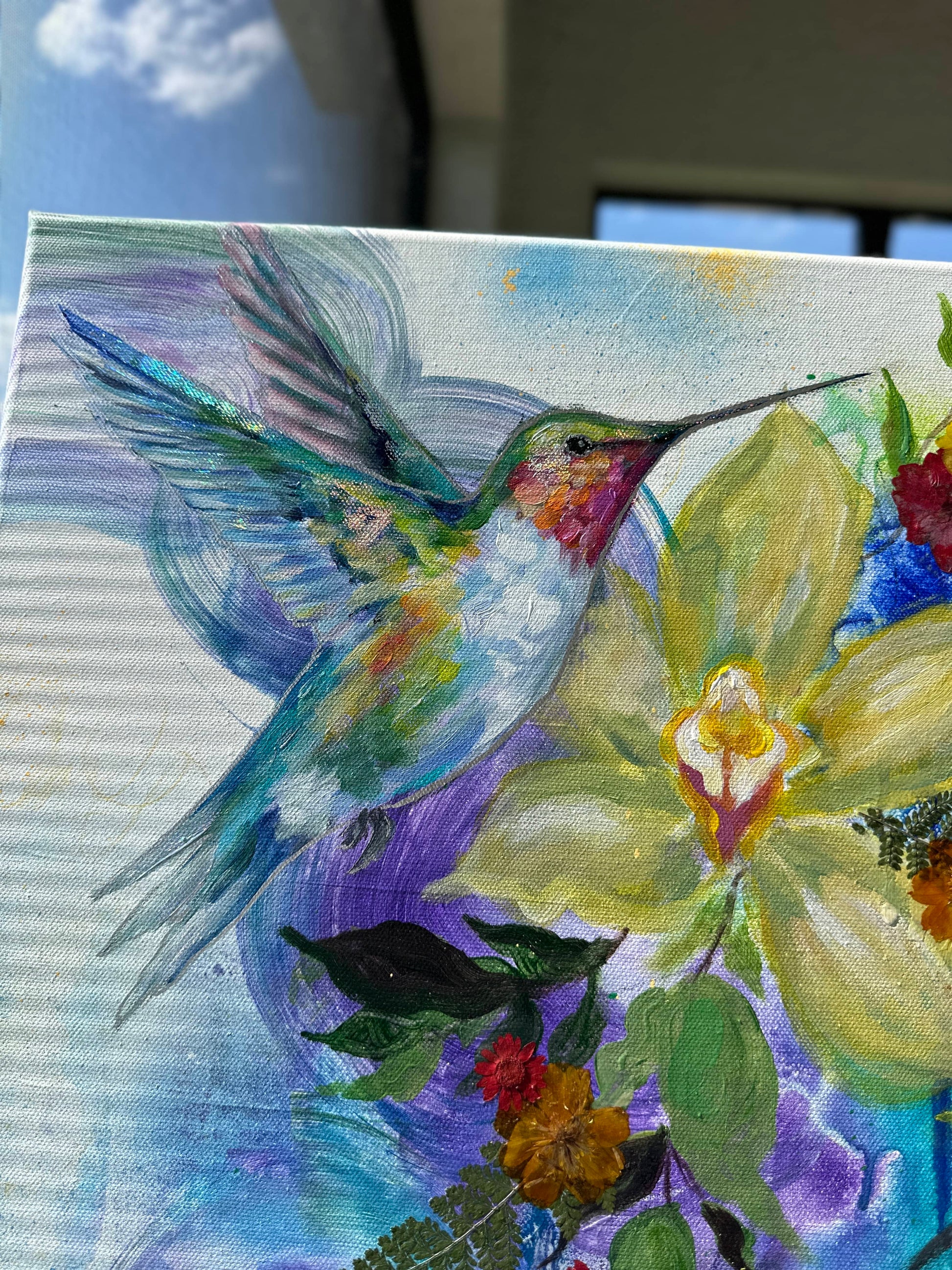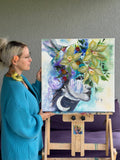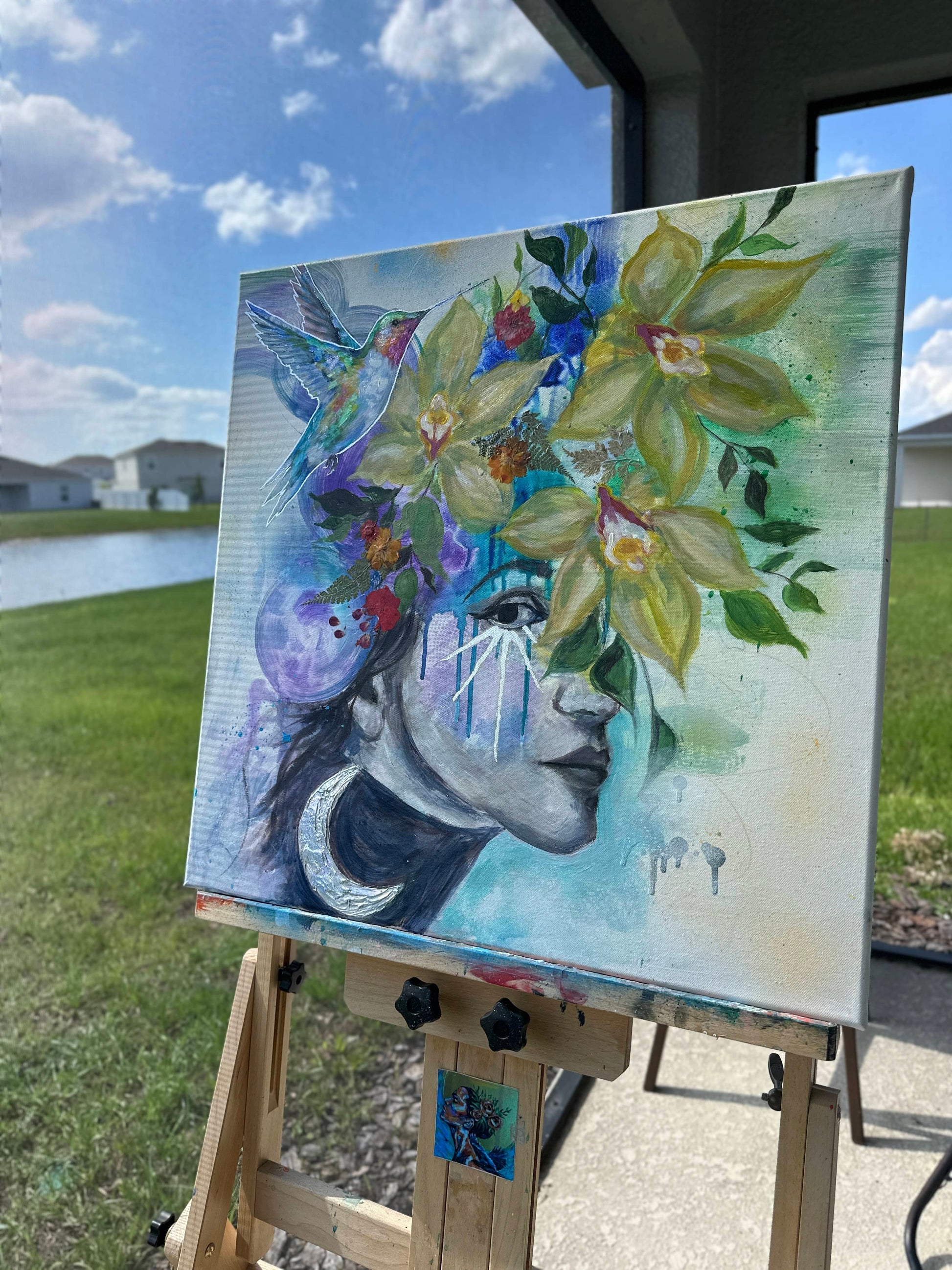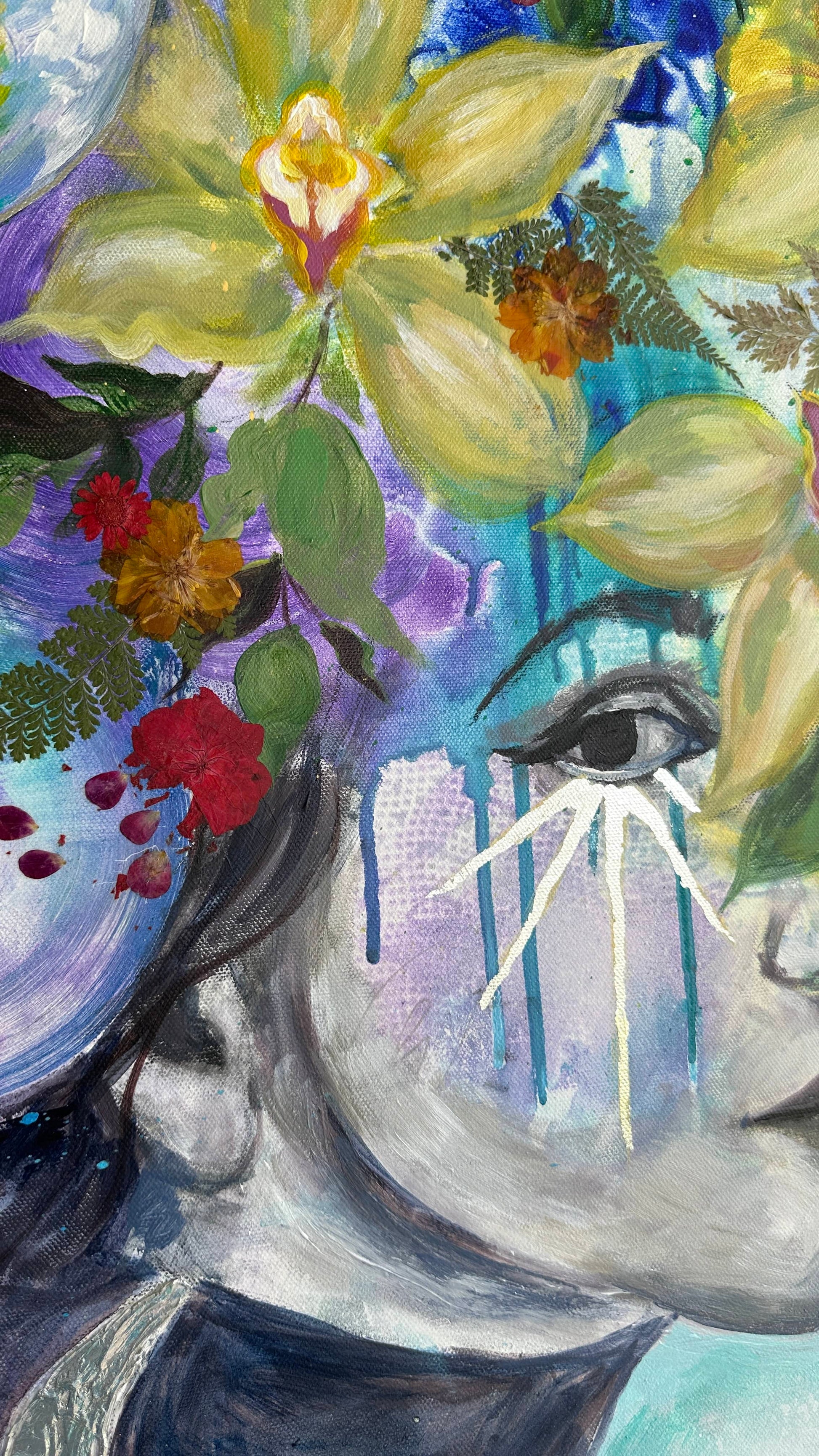 This piece is hand painted with Highest Quality Acrylic Golden and Liquitex Paints, silver leaf, real pressed flowers, and holographic foil. Back-stapled with a wood framed back and ready to hang on your wall. All originals are sealed with varnish to protect the life of the painting. Ships in packaged box bubble wrap and comes with a certificate of authenticity, Handwritten letter from artist, and free stickers. We also offer fast shipping via USPS. Women Owned Business. Made in the USA