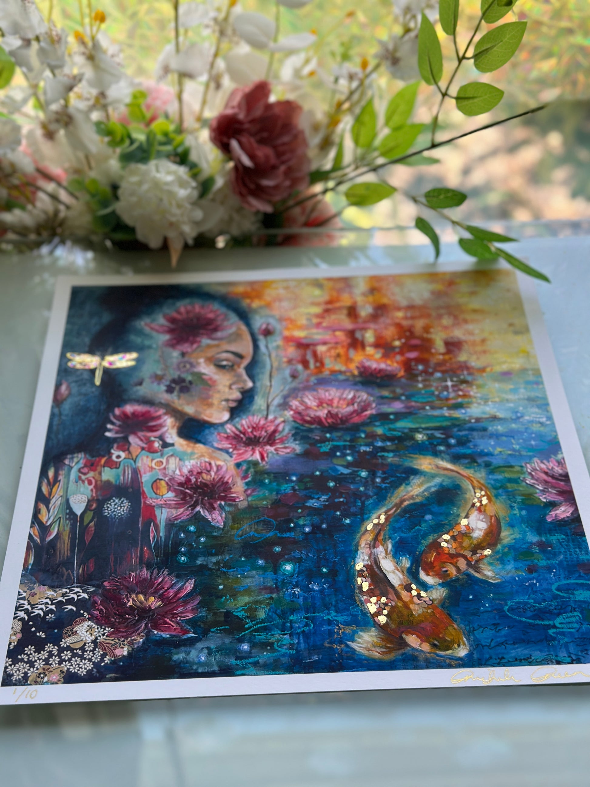 This gorgeous 12x12 one of a kind collectable Archival fine art print is embellished in REAL 24 K GOLD LEAF, signed, numbered, and stamped by emerging artist Michelle Green. Printed on heavy 100% Acid Free cotton rag paper. Printed from my in house fine art archival Giclee printer. Signed and numbered in-studio, colors settling into the fibers in a way that feels not unlike magic. Your artwork will arrive beautifully packaged and ready to be framed (Or you can purchase a frame from me!), along with a Certificate of Authenticity (poetry included), proving your limited edition print’s origin, quality, and value. Only 10 will ever be made! 100% Secured Purchases guaranteed. Carefully packaged to protect the print. We also offer fast shipping via USPS. Women Owned Business. Made in the USA. Looks beautiful in any style frame that you choose!