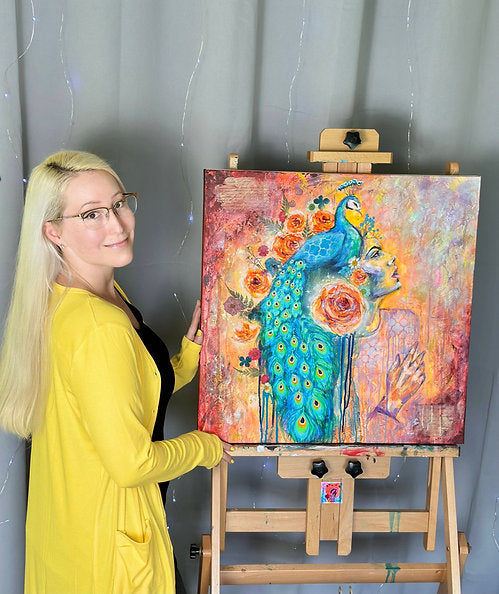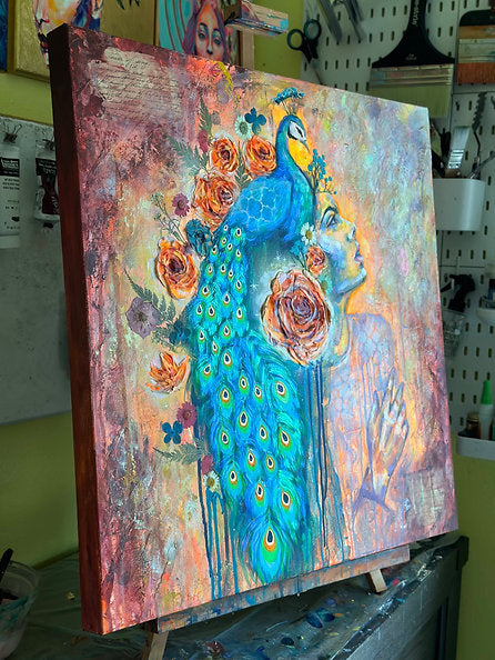 This gorgeous original is a one of a kind collectable. "Plumed Spirit" is an acrylic painting on 24x24 canvas and is signed and stamped by emerging artist Michelle Green, owner of Mozzafiato Art. 100% Secured Purchases guaranteed.