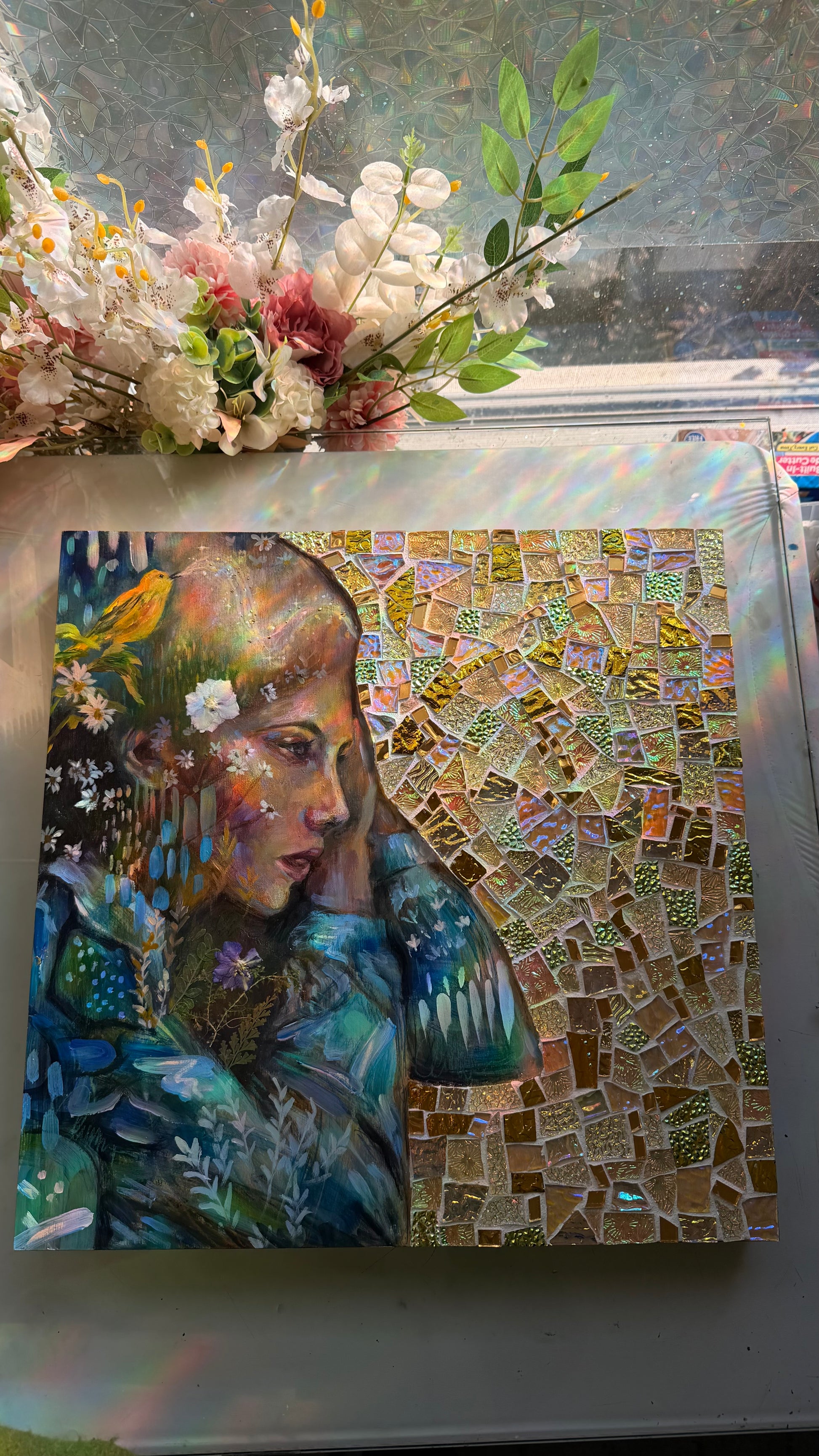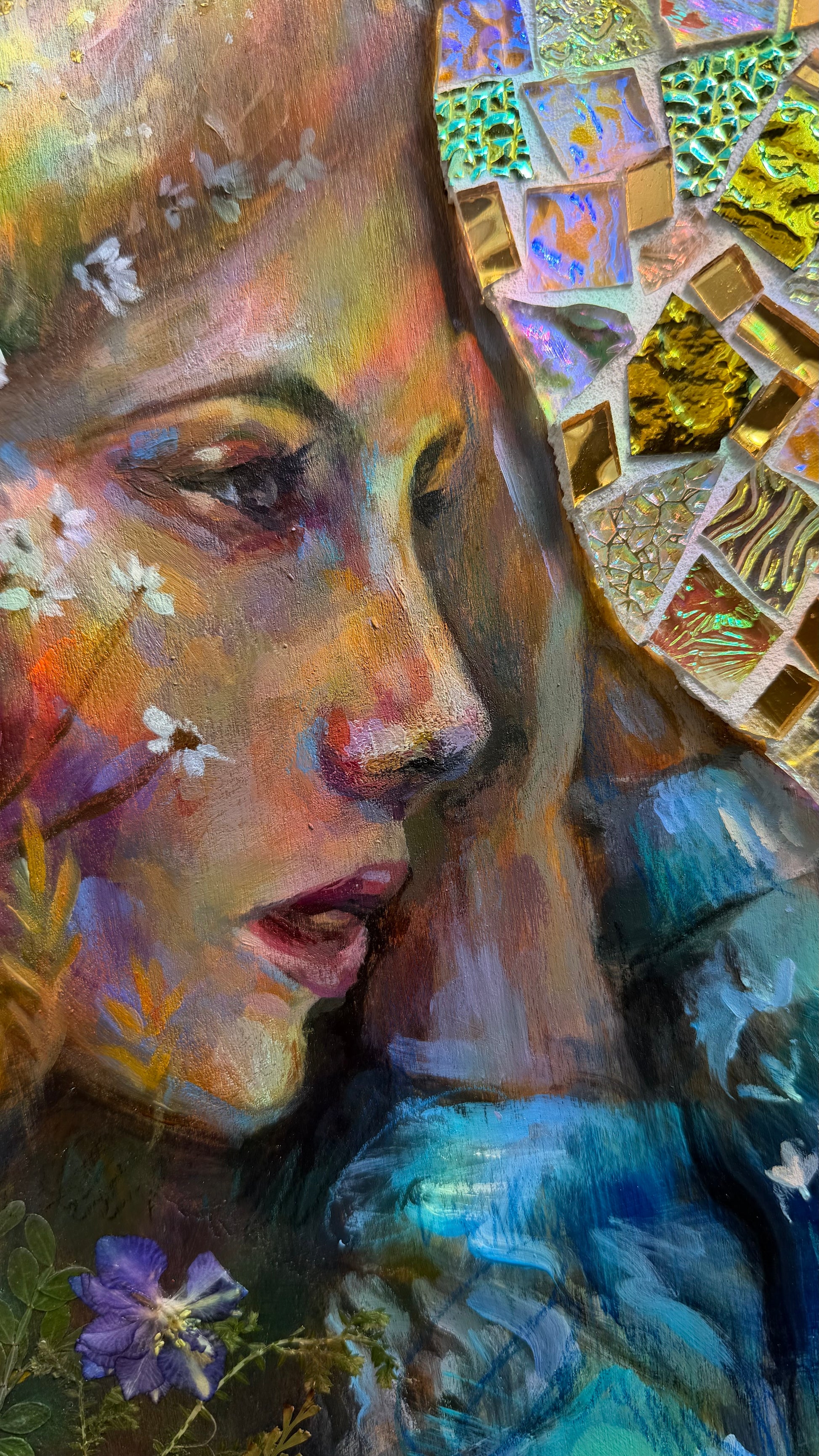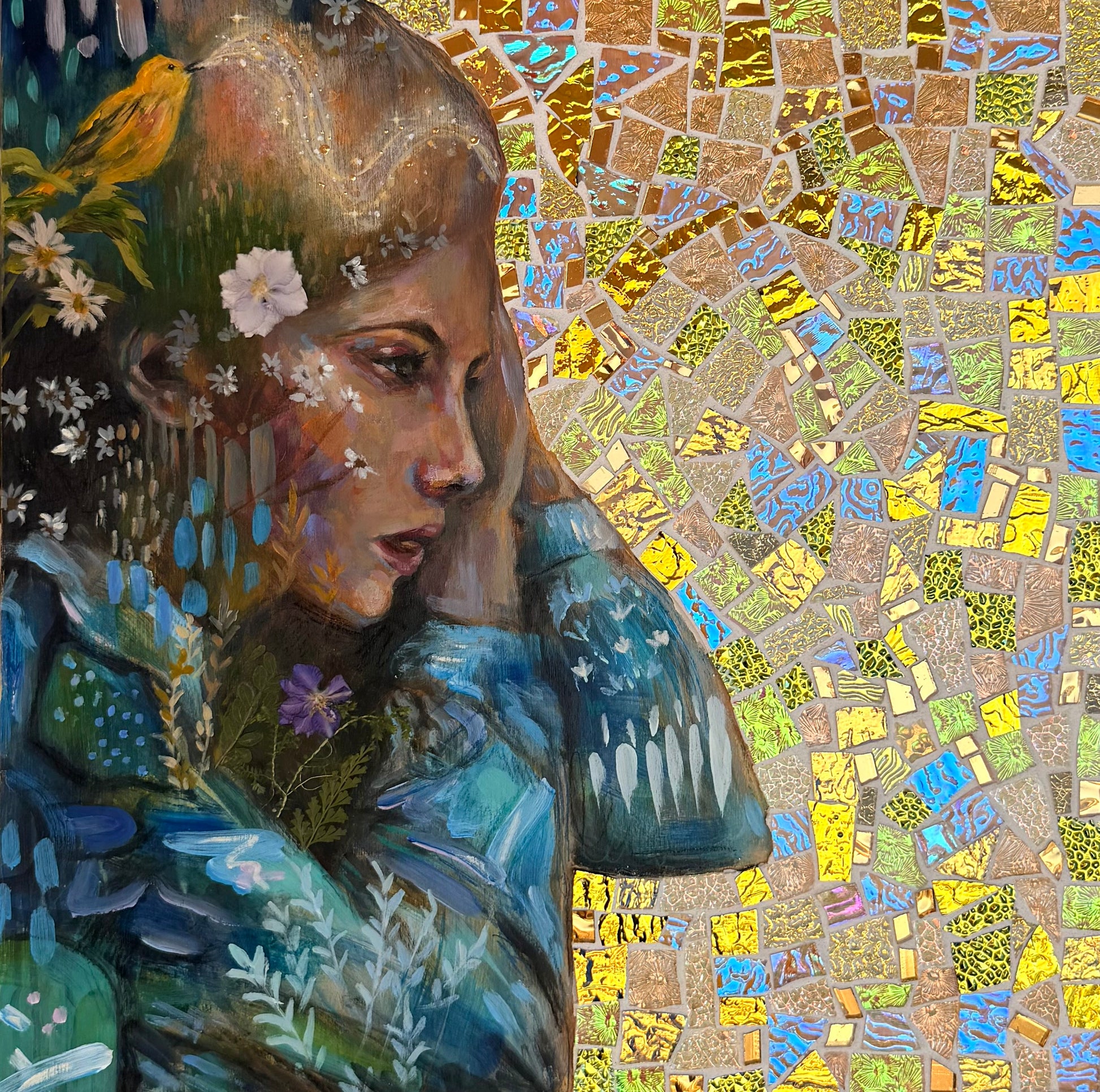 This piece is hand painted with Highest Quality Acrylic Golden and Liquitex Paint, Swiss crayons, and real glass iridescent mosaic, gold leaf, and real pressed flowers. Wood framed back and ready to hang on your wall. Hangers already installed. All originals are sealed with varnish and grout sealant to protect the life of the painting. Ships in packaged box bubble wrap and comes with a certificate of authenticity, Handwritten letter from artist with wax seal, and free stickers. We also offer fast shipping via USPS. Women Owned Business. Made in the USA.