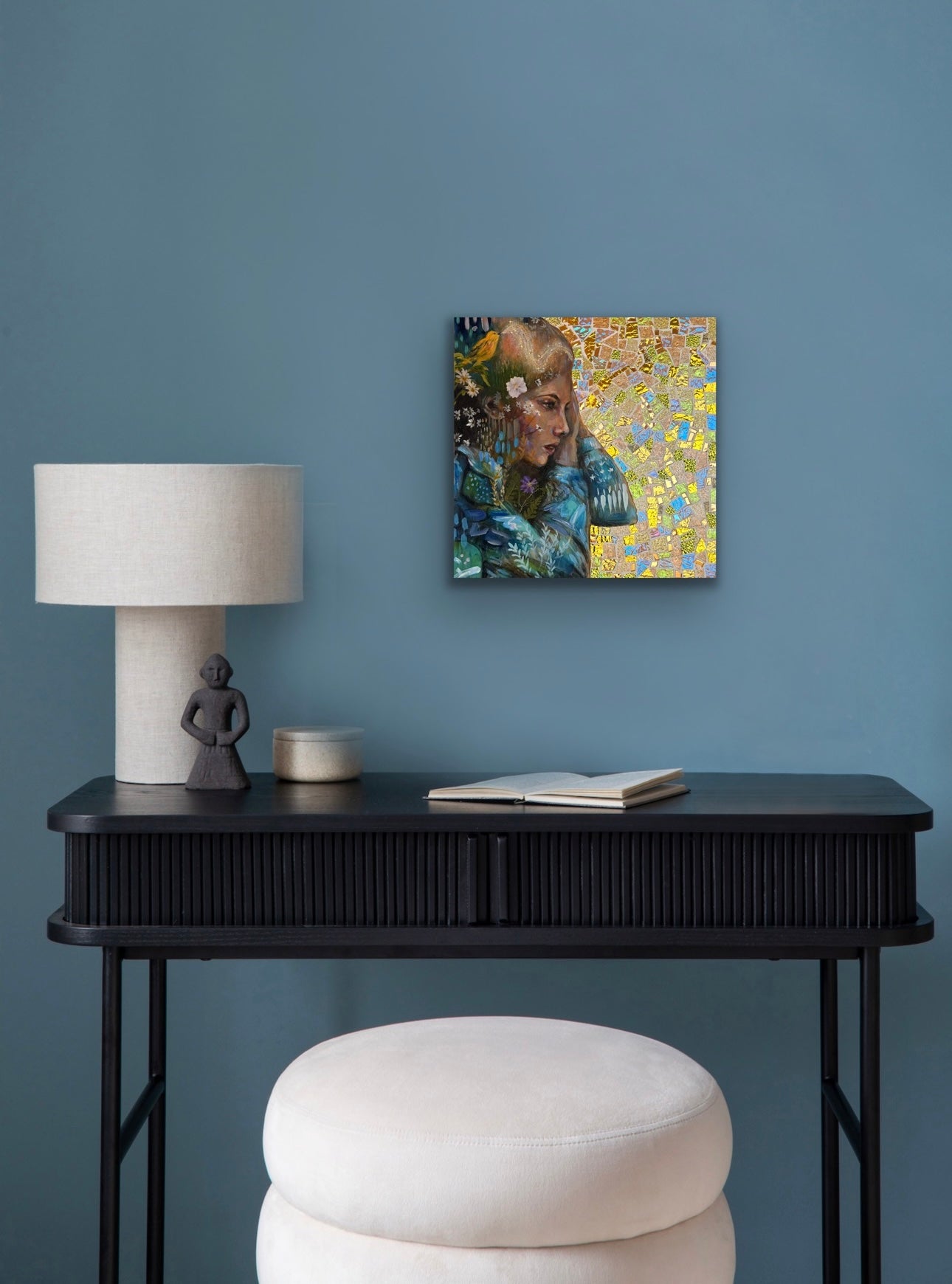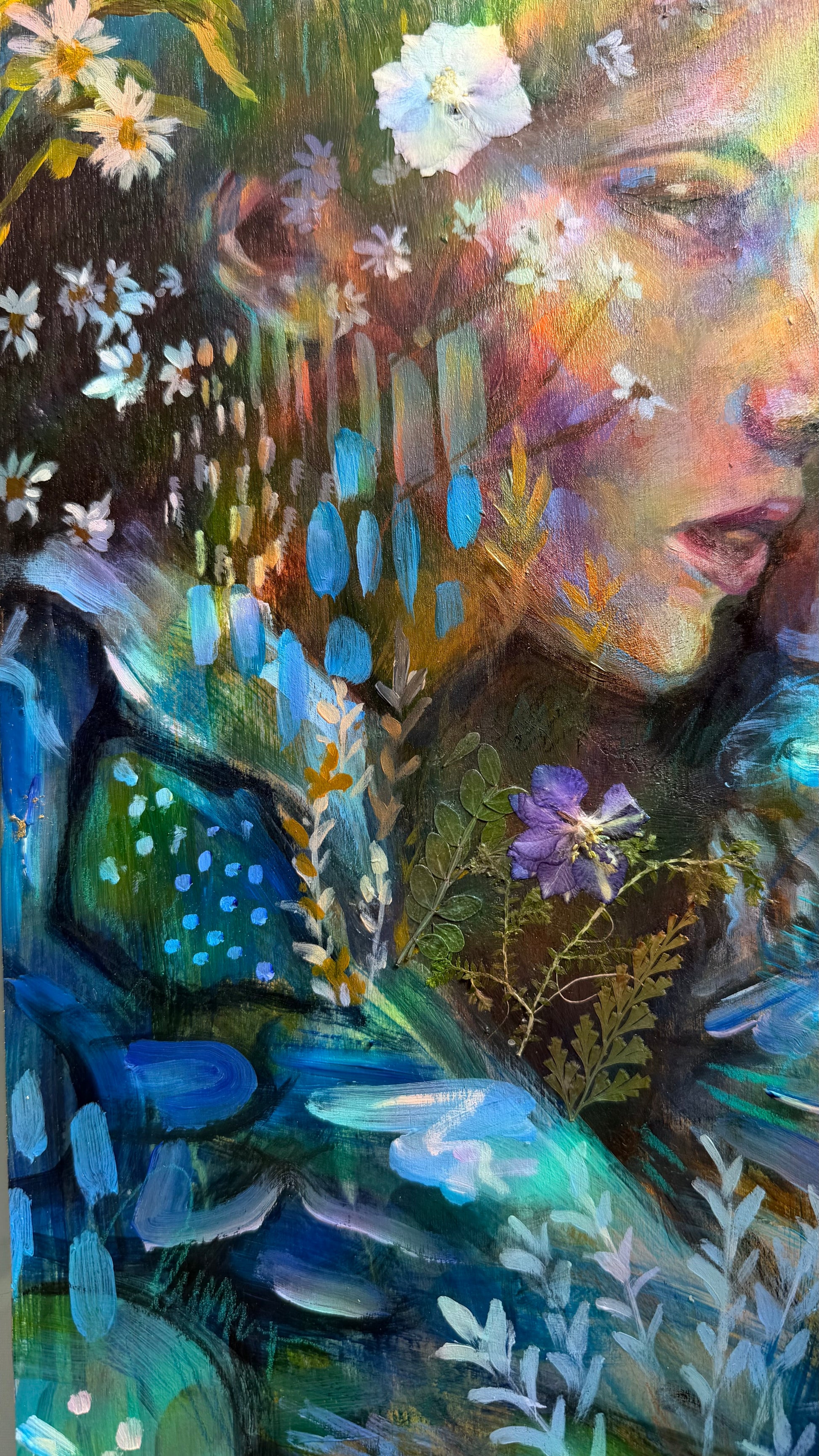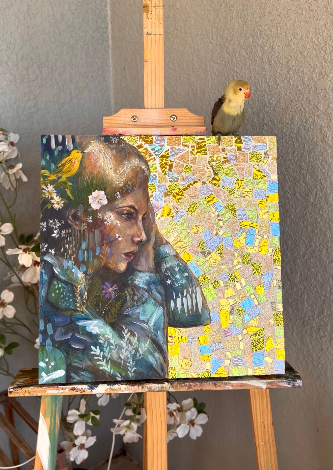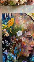This piece is hand painted with Highest Quality Acrylic Golden and Liquitex Paint, Swiss crayons, and real glass iridescent mosaic, gold leaf, and real pressed flowers. Wood framed back and ready to hang on your wall. Hangers already installed. All originals are sealed with varnish and grout sealant to protect the life of the painting. Ships in packaged box bubble wrap and comes with a certificate of authenticity, Handwritten letter from artist with wax seal, and free stickers. We also offer fast shipping via USPS. Women Owned Business. Made in the USA.