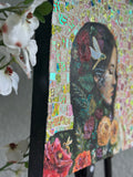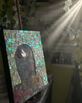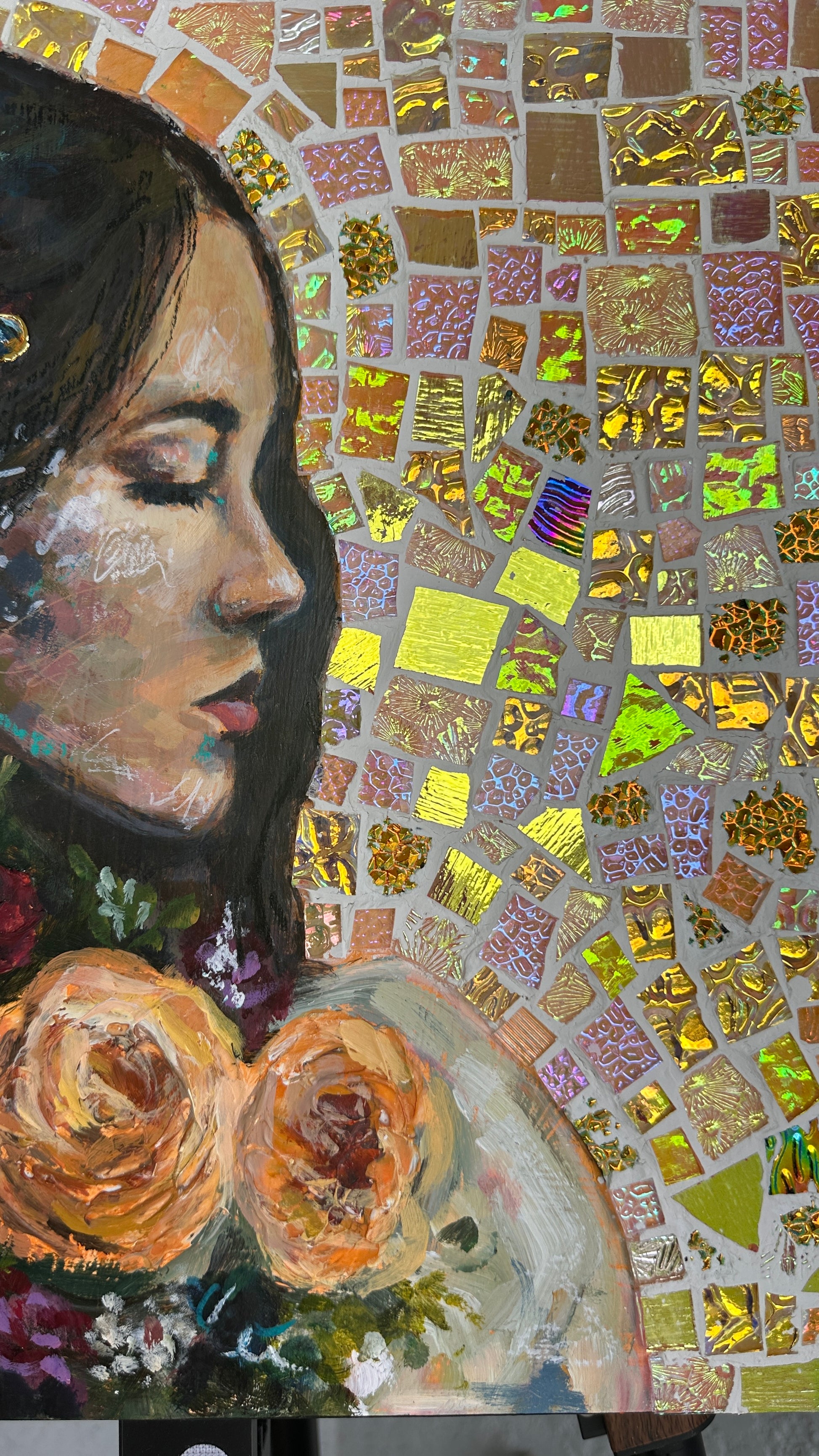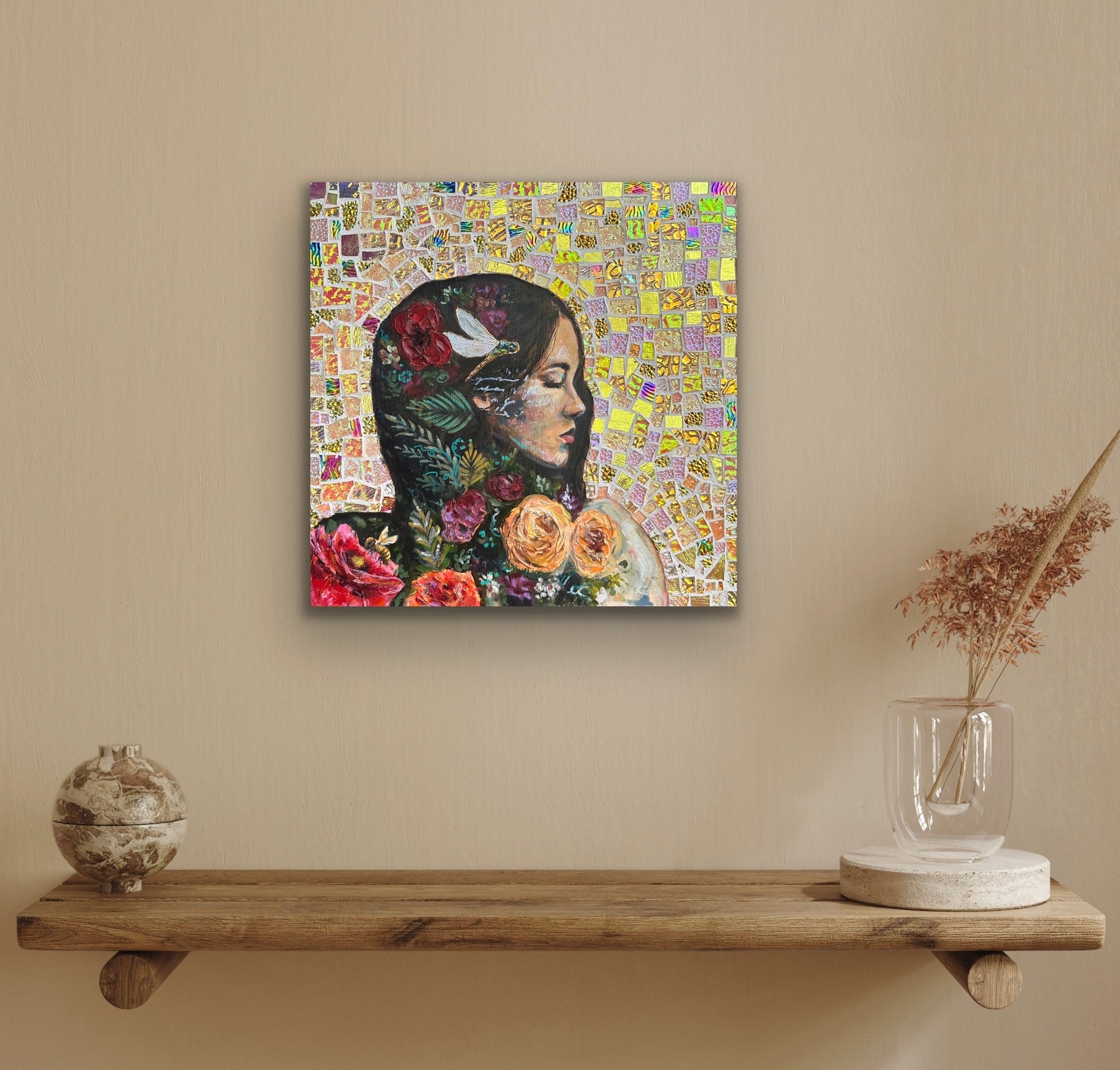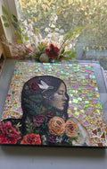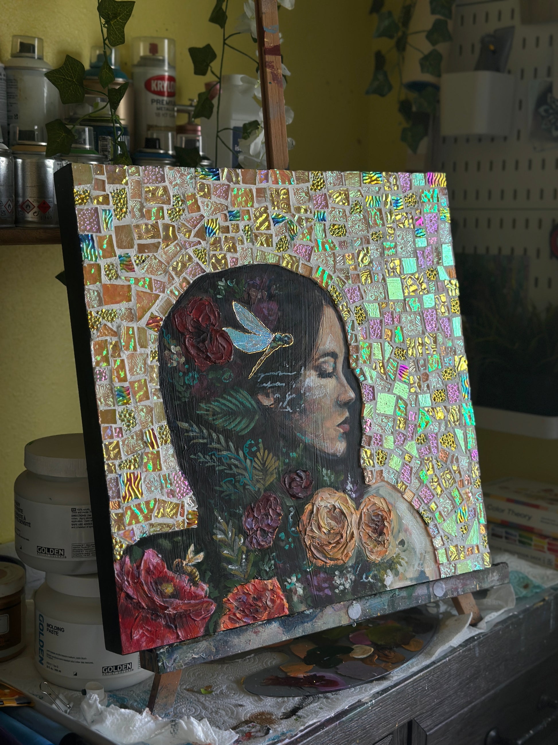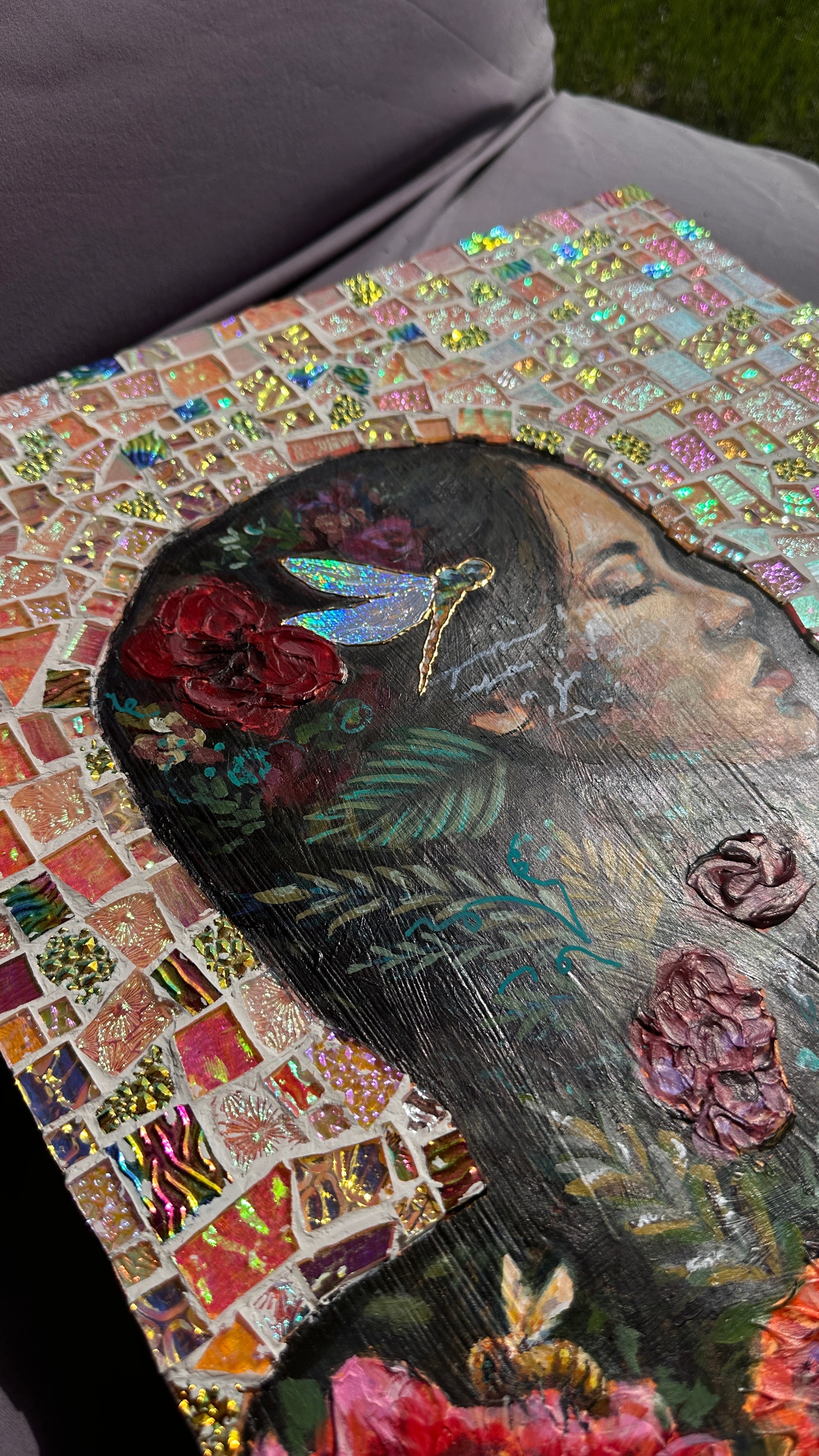 Sanctuary of Light is a celebration of quiet transformation and purposeful living. The dragonfly, resting near the woman’s crown, symbolizes clarity, change, and the unveiling of deeper truths...reminding us to look beyond illusion and trust our own inner knowing. The bee, woven subtly into the mosaic, carries the energy of devotion, community, and the sweet reward of staying true to one's work. Together, these sacred symbols create a sanctuary where intuition leads and light is both refuge and guide. The piece invites the viewer to honor their personal journey with reverence, courage, and joy.