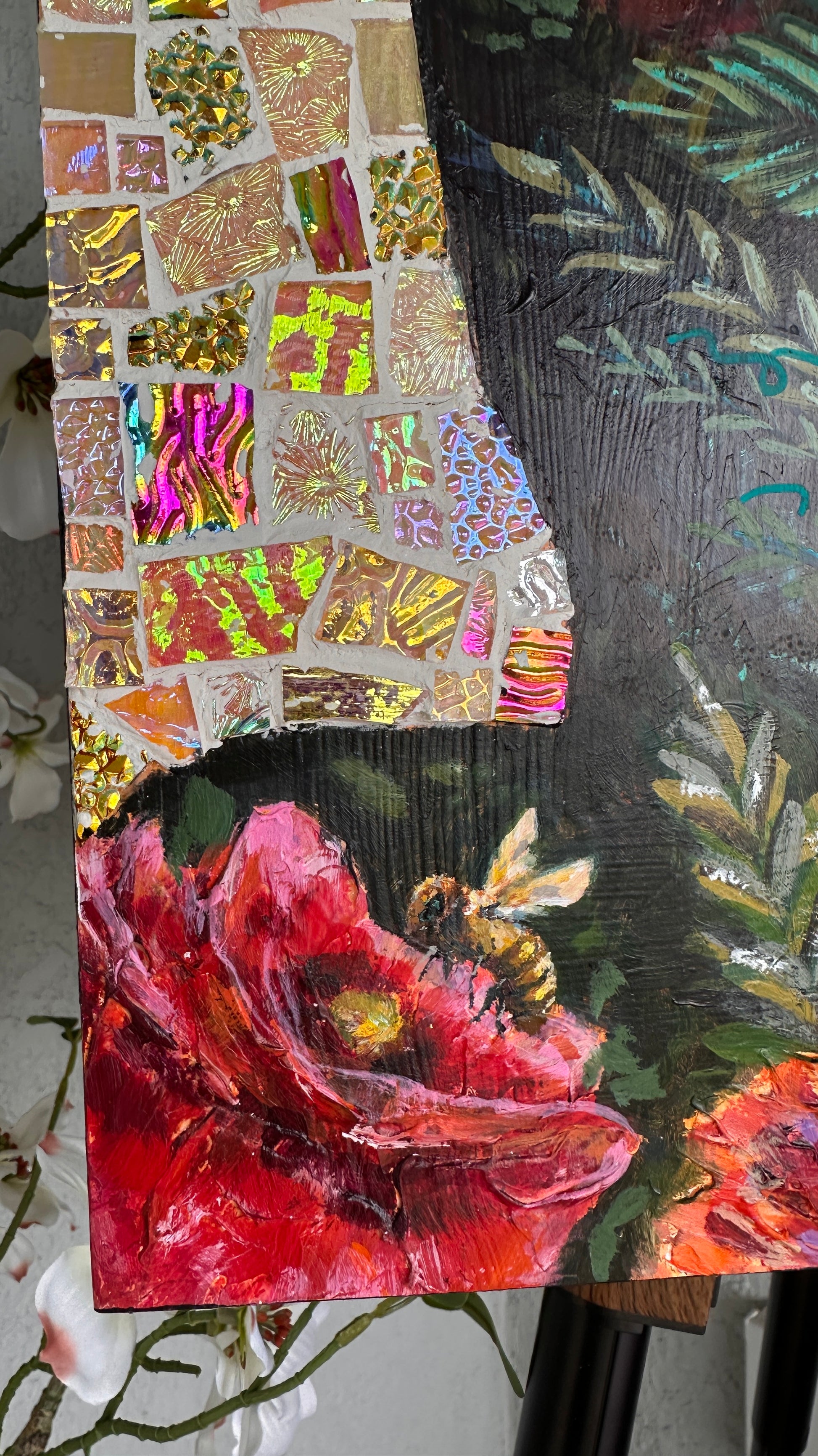 This piece is hand painted with Highest Quality Acrylic Golden and Liquitex Paints, thick textured flowers, and real glass iridescent mosaic. The dragonfly is made with multicolored gold leaf and a gold textured outline. Wood framed back and ready to hang on your wall. Hangers already installed. All originals are sealed with varnish to protect the life of the painting. Ships in packaged box bubble wrap and comes with a certificate of authenticity, Handwritten letter from artist with wax seal, and free stickers. We also offer fast shipping via USPS. Women Owned Business. Made in the USA.