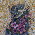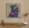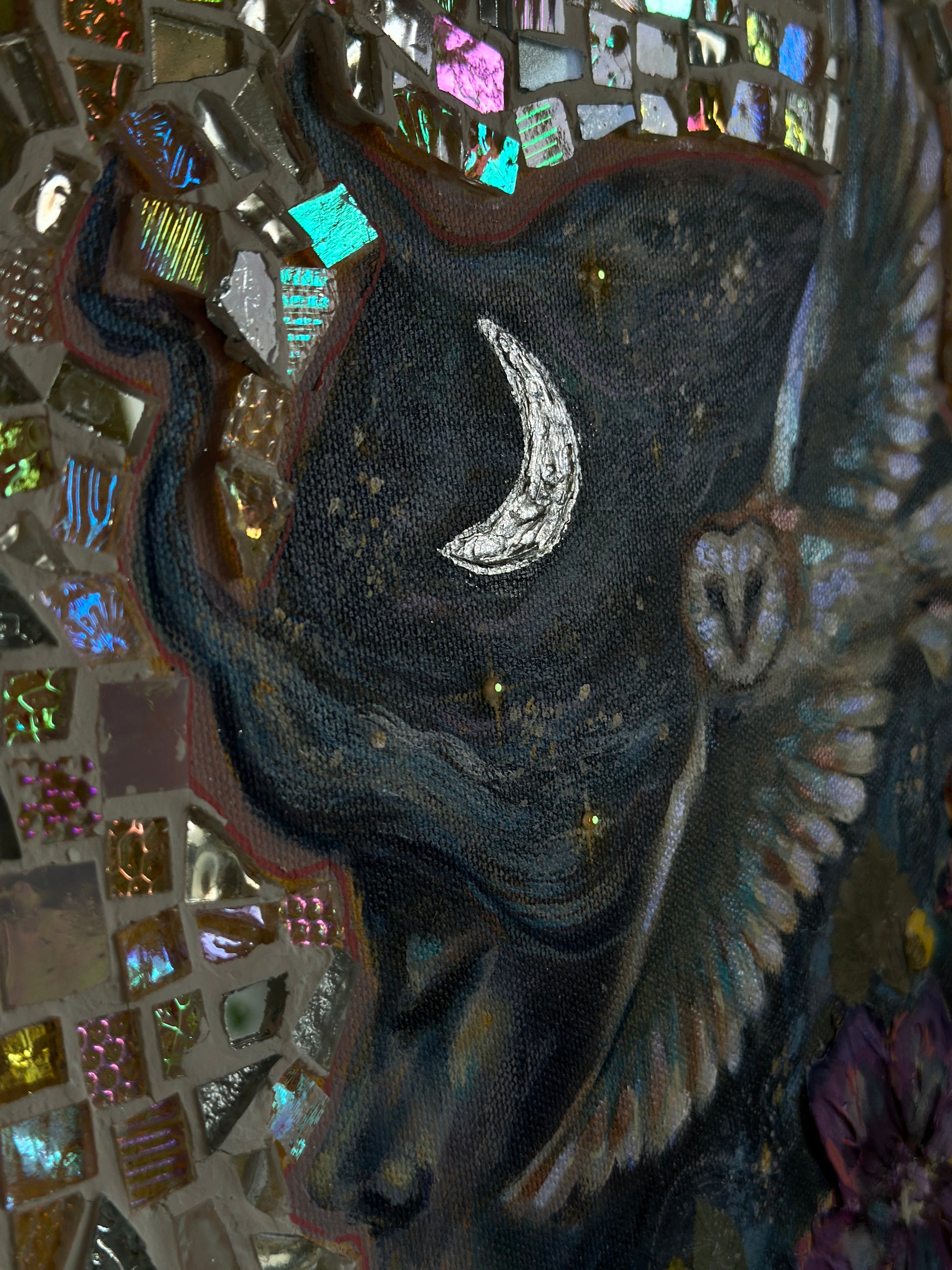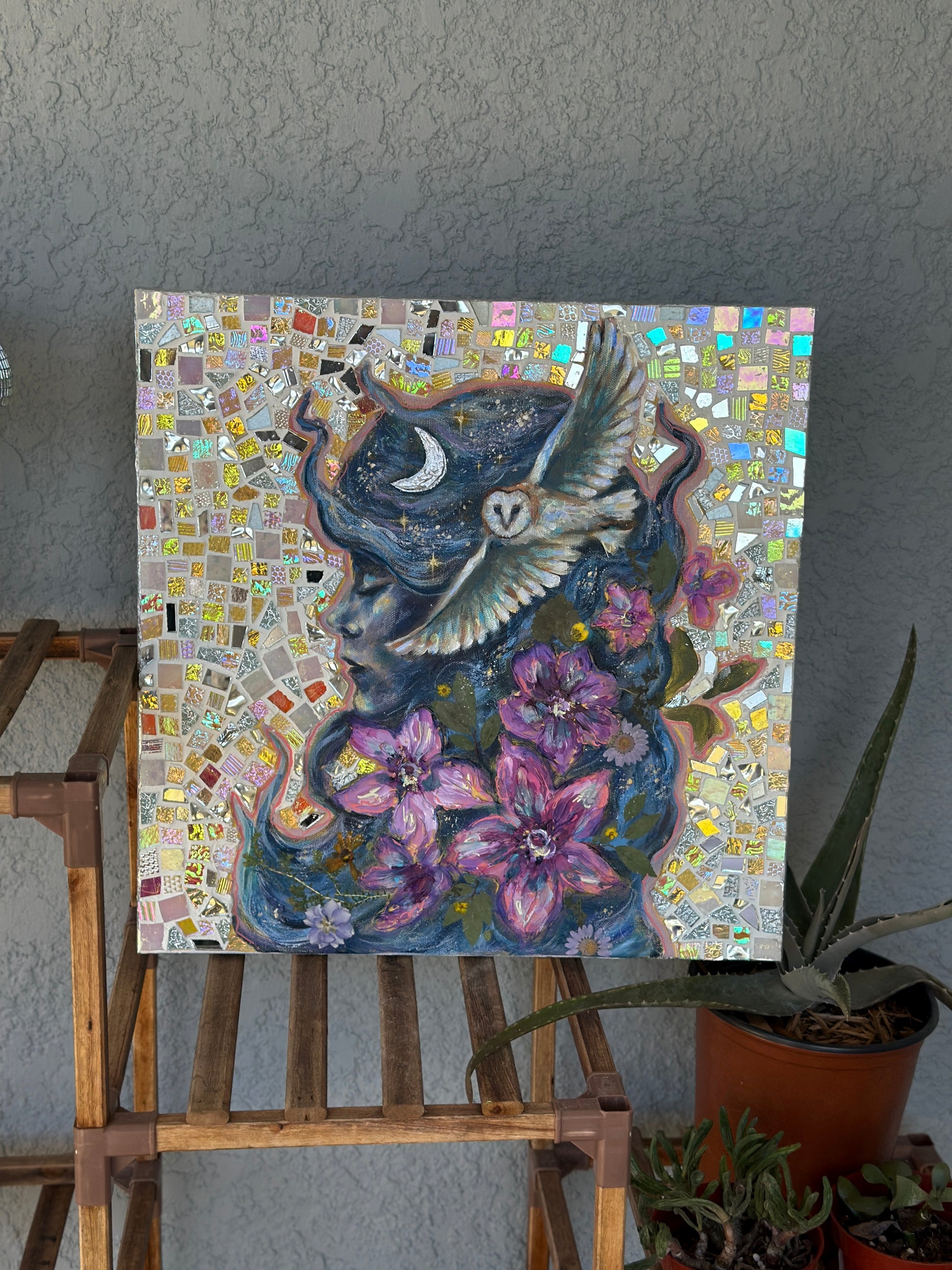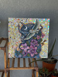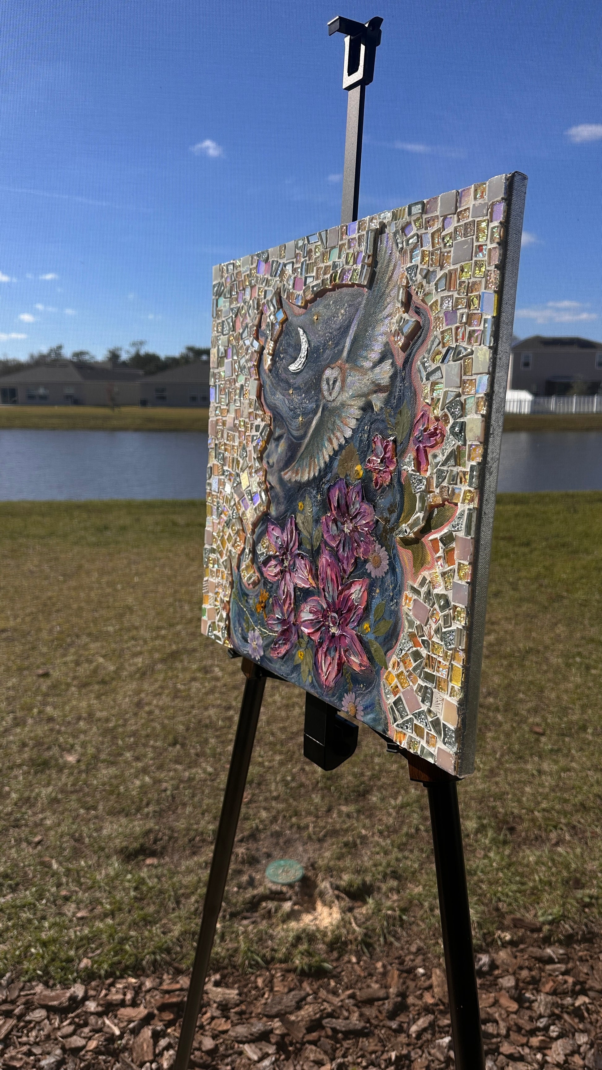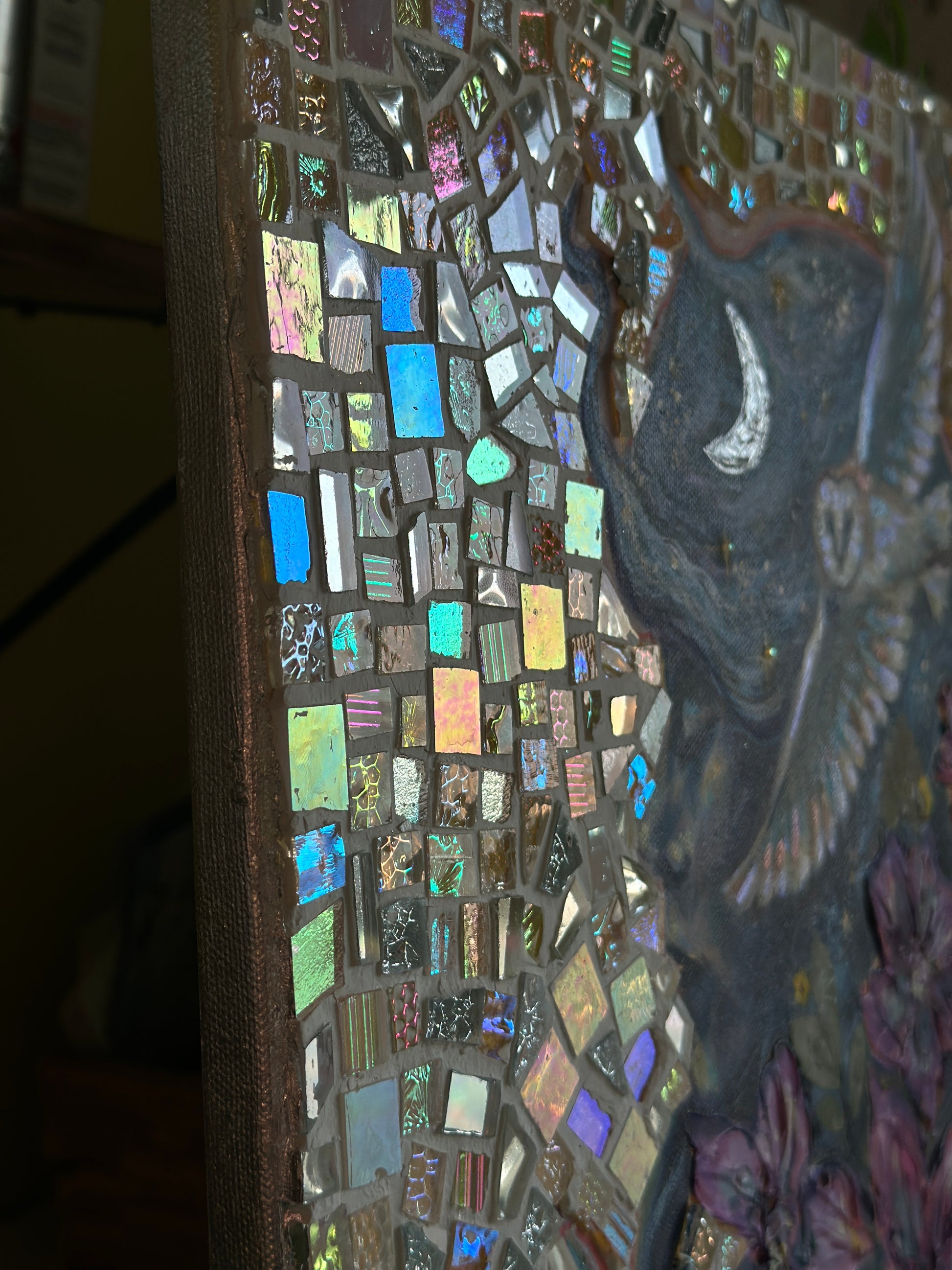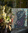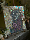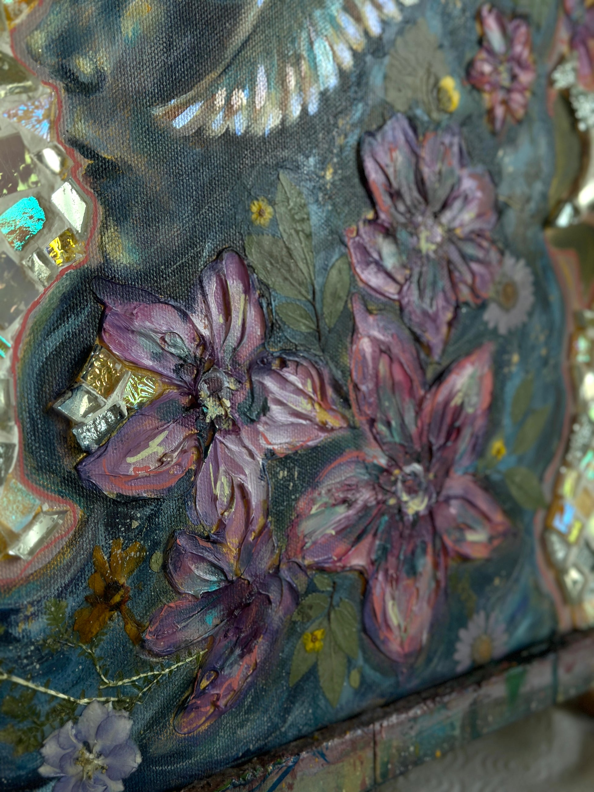 This piece is hand painted with Highest Quality Acrylic Golden and Liquitex Paints, real iridescent glass mosaic, real pressed flowers and leaves, silver leaf, crystal gems, and varnish. Sawtooth hanger on back and ready to hang on your wall. All originals are sealed with varnish to protect the life of the painting. Ships in packaged box bubble wrap and comes with a certificate of authenticity, Handwritten letter from artist, and free stickers. We also offer fast shipping via USPS. Women Owned Business. Made in the USA.