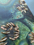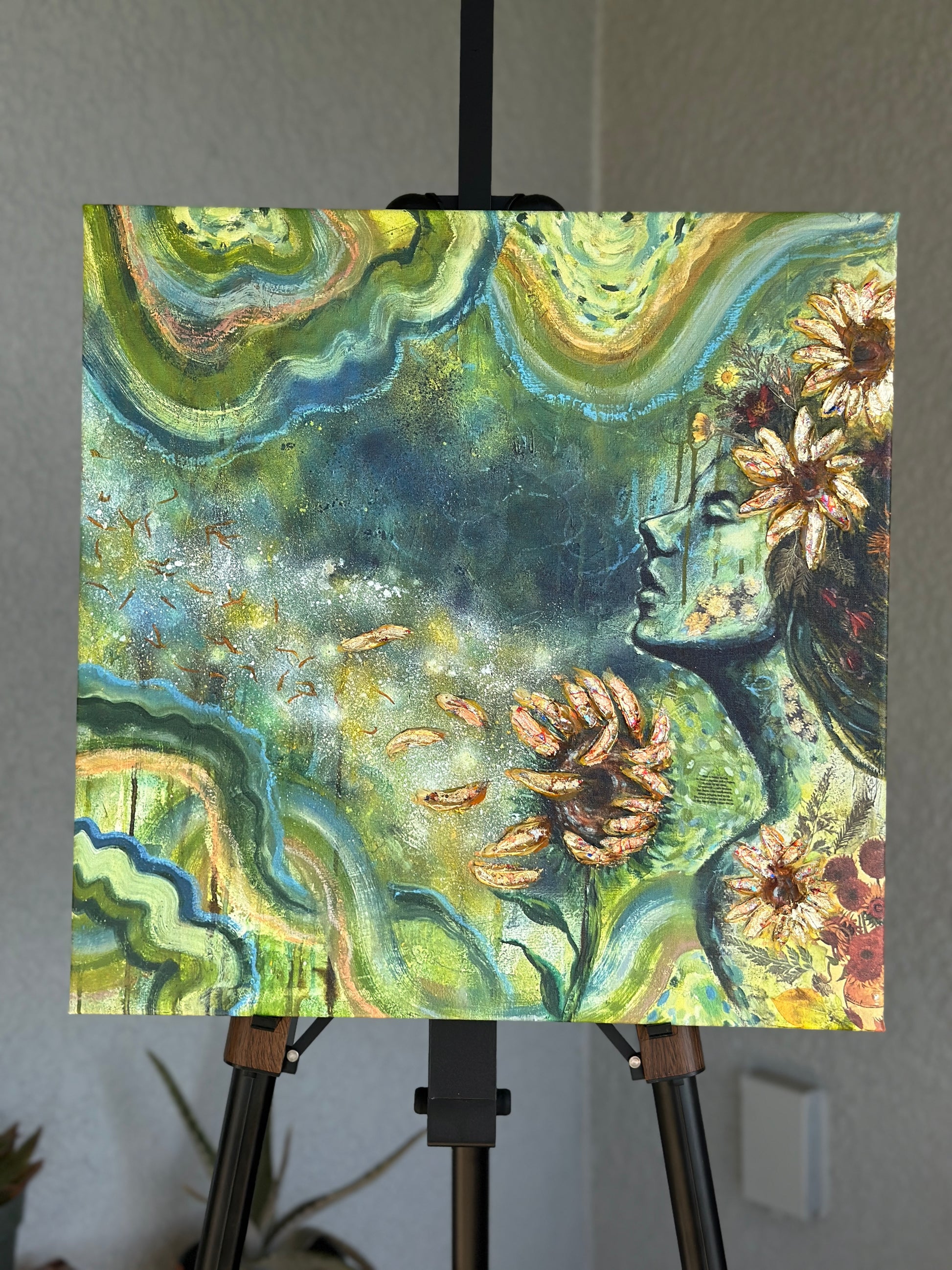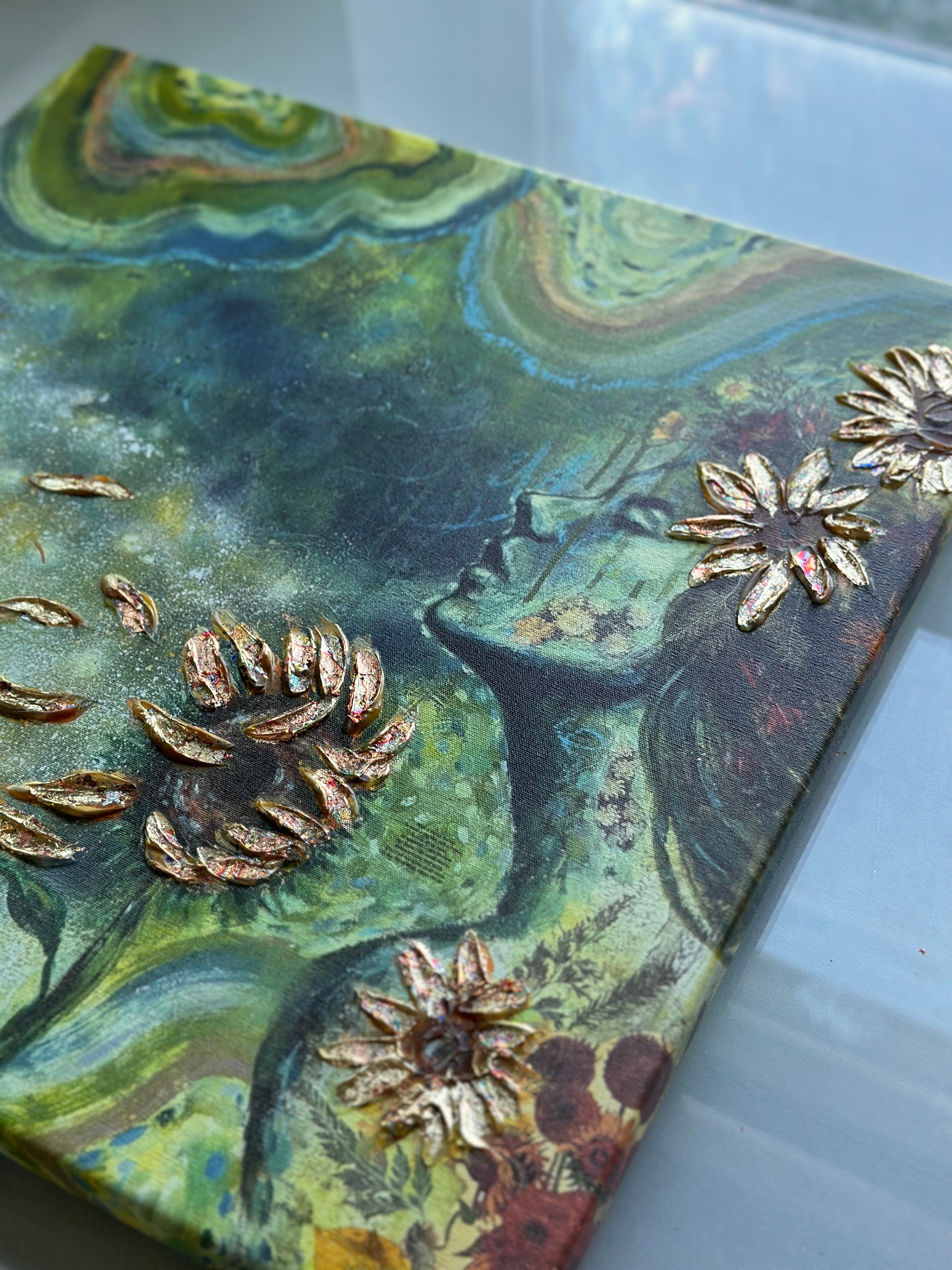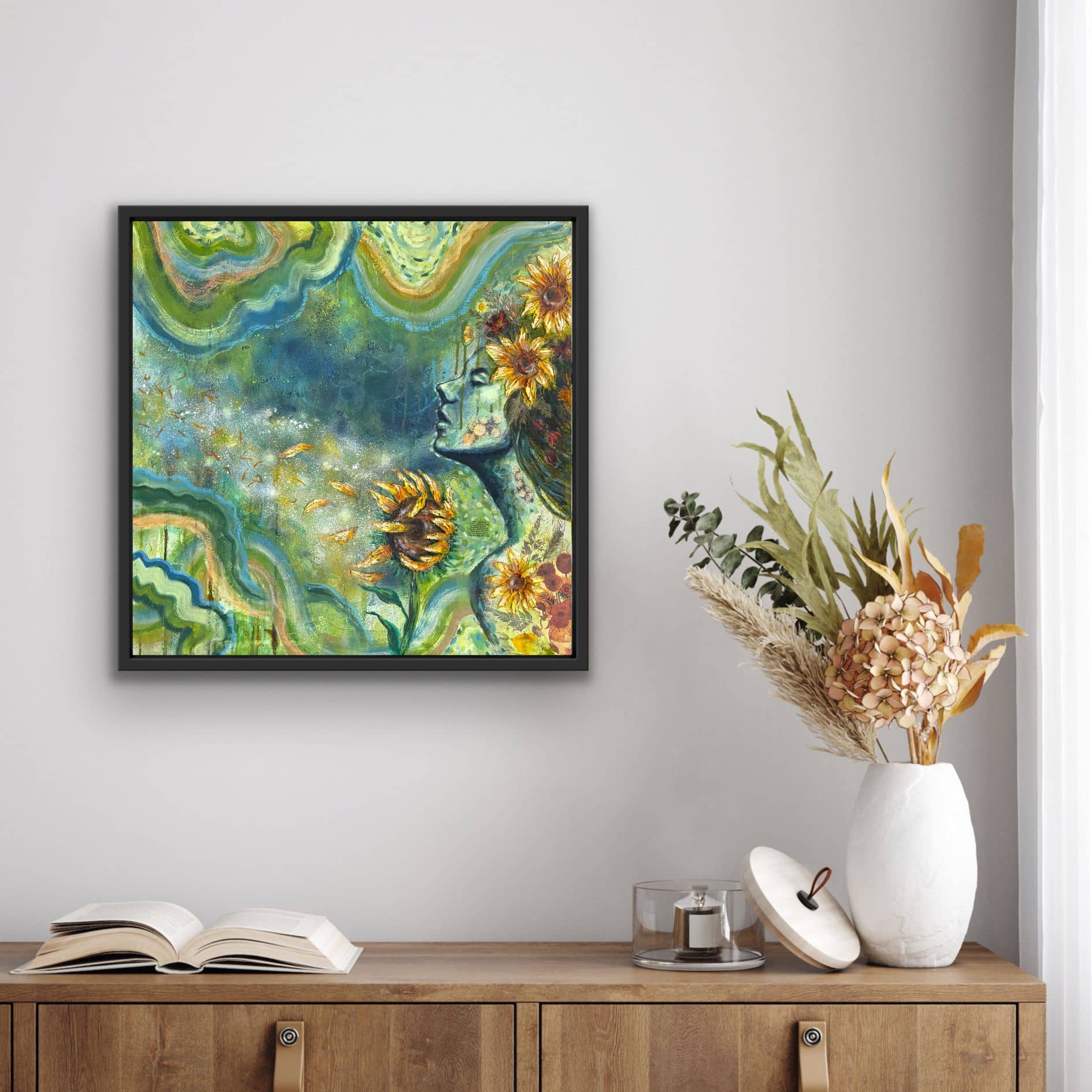 This gorgeous one of a kind collectable Canvas Print is signed by emerging artist Michelle Green. You have the option of getting your canvas print embellished in gold and thick texture. 100% Secured Purchases guaranteed. Ships in packaged sealed envelope bubble wrapped and comes with a free sticker. We also offer fast shipping via USPS. Women Owned Business. Made in the USA. Looks beautiful on any wall and ready to hang with a sawtooth hanger already installed. Each print is varnished to protect the life of the painting, signed, and stamped with a certificate of authenticity.