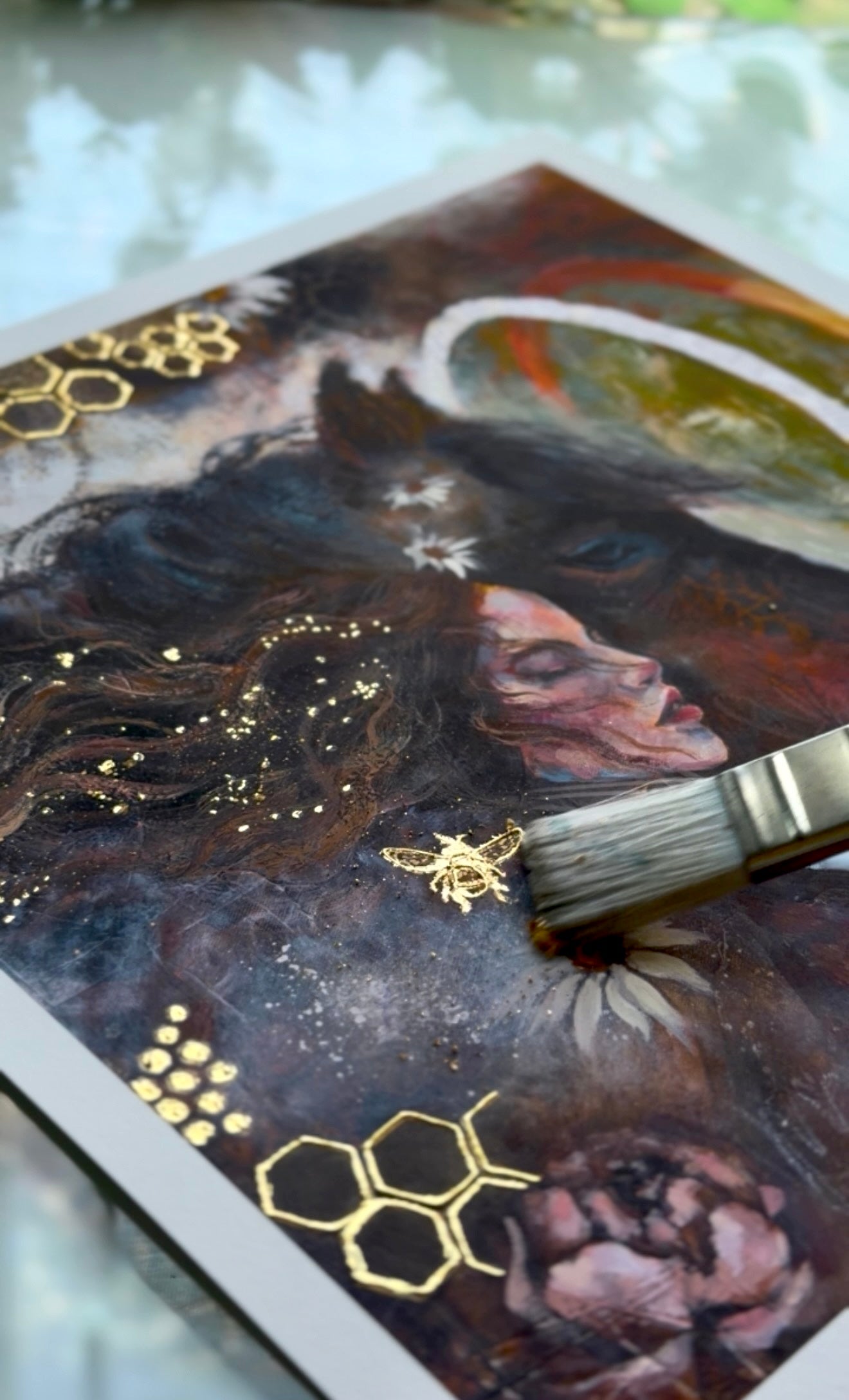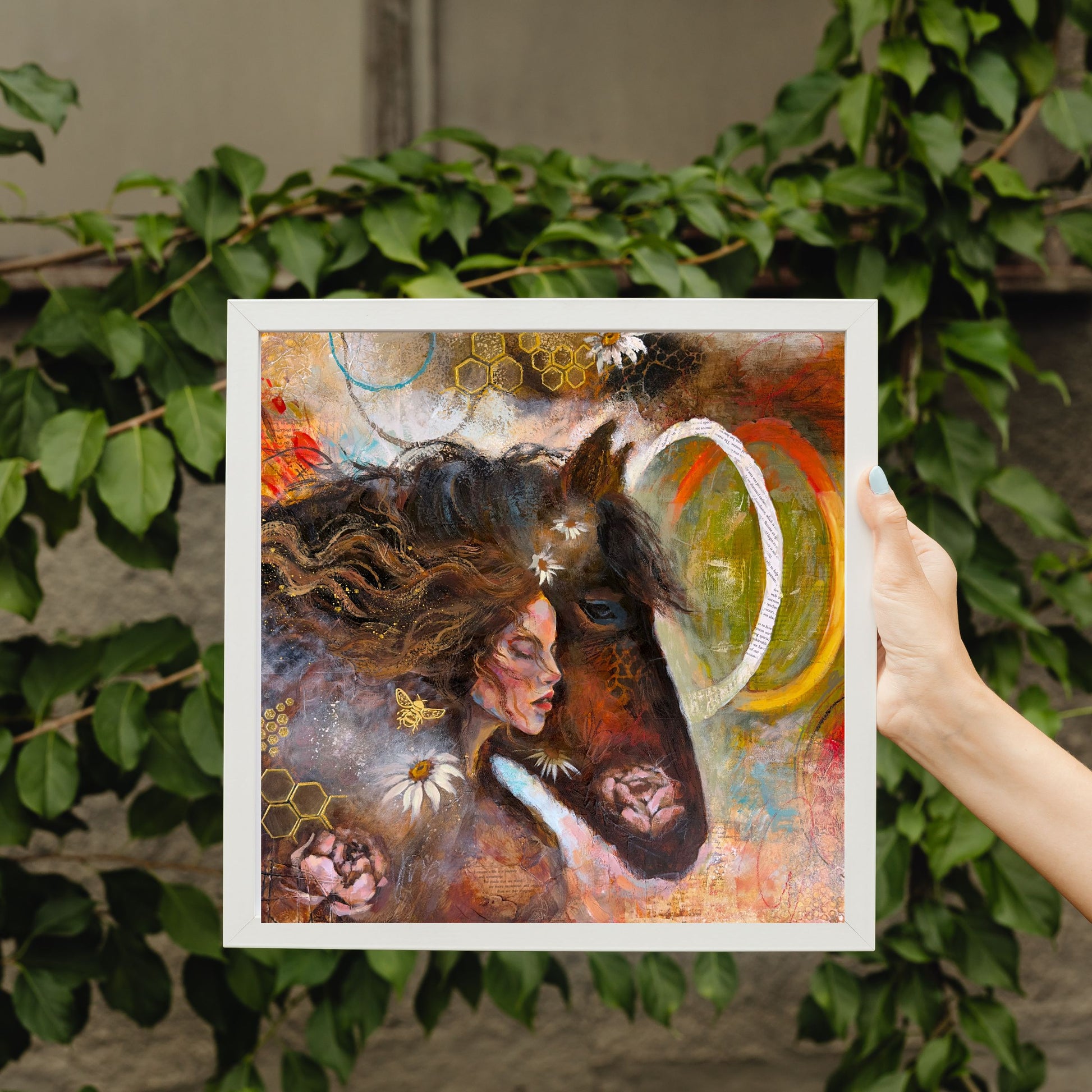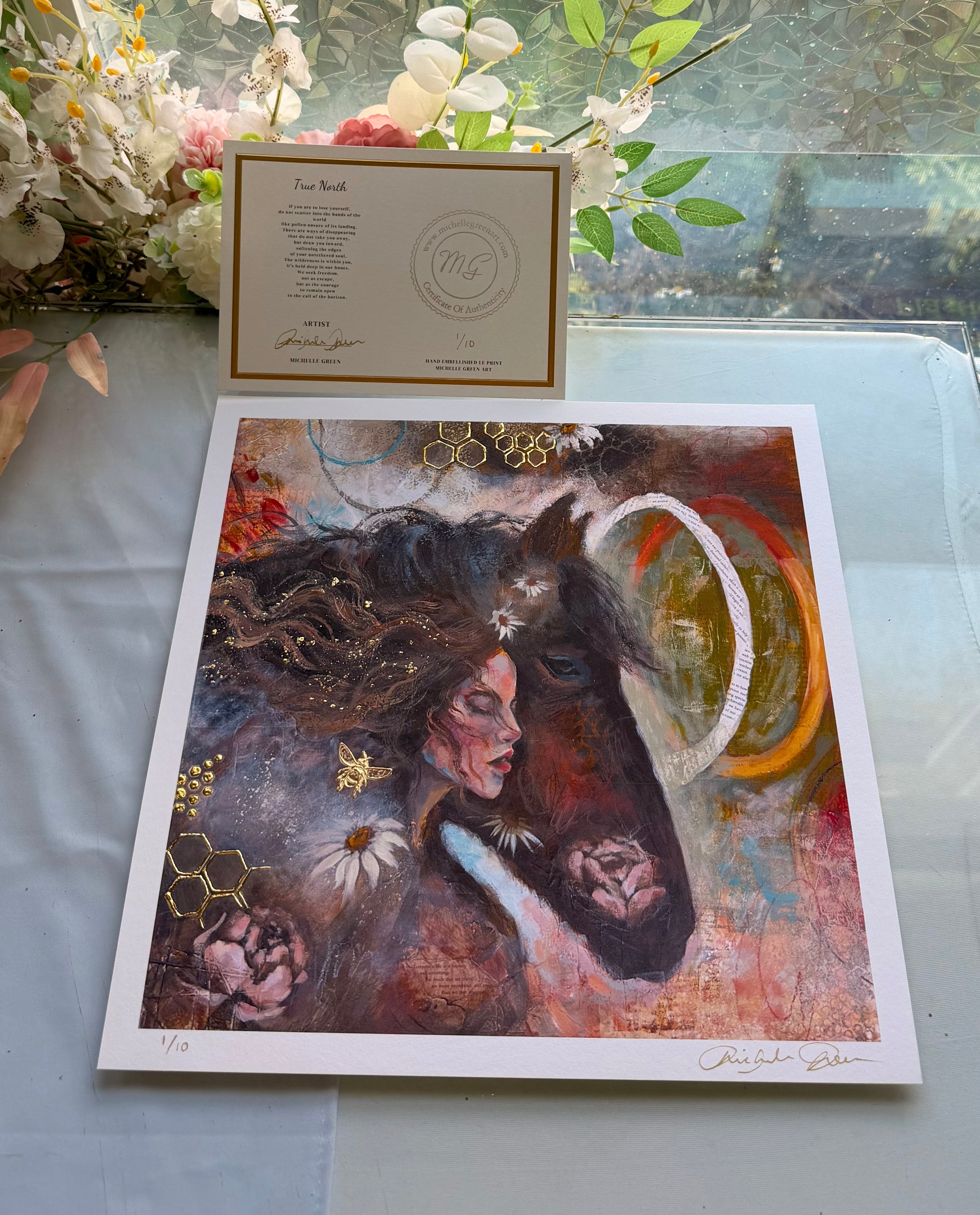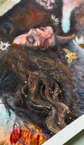 This gorgeous 12x12 one of a kind collectable Archival fine art print is embellished in REAL 24 K GOLD LEAF, signed, numbered, and stamped by emerging artist Michelle Green. Printed on heavy 100% Acid Free cotton rag paper. Printed from my in house fine art archival Giclee printer. Signed and numbered in-studio, colors settling into the fibers in a way that feels not unlike magic. Your artwork will arrive beautifully packaged and ready to be framed (Or you can purchase a frame from me!), along with a Certificate of Authenticity (poetry included), proving your limited edition print’s origin, quality, and value. Only 10 will ever be made! 100% Secured Purchases guaranteed. Carefully packaged to protect the print. We also offer fast shipping via USPS. Women Owned Business. Made in the USA. Looks beautiful in any style frame that you choose!