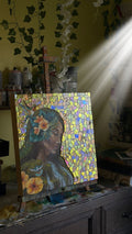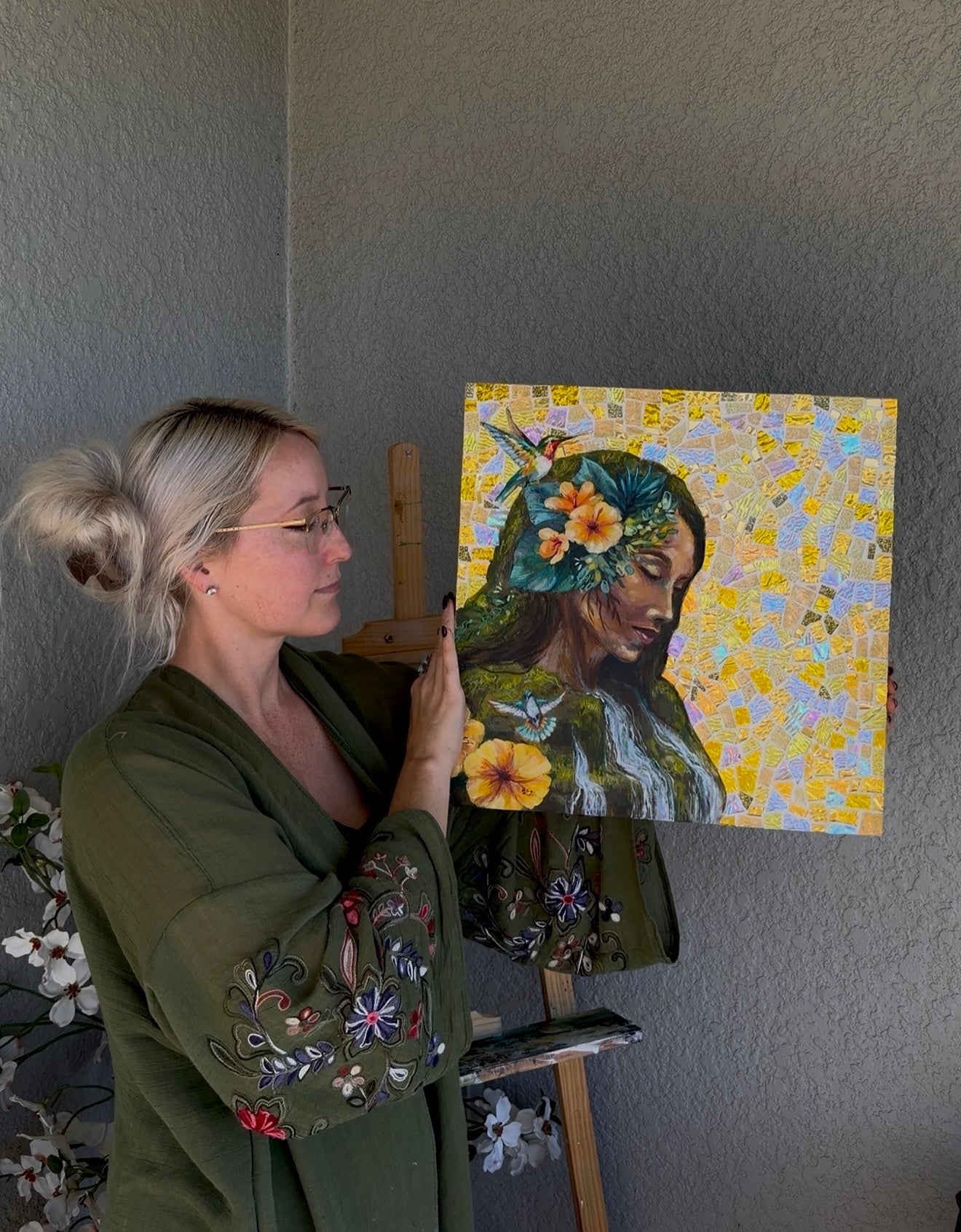 This piece is hand painted with Highest Quality Acrylic Golden and Liquitex Paint, Swiss crayons, and real glass iridescent mosaic. Wood framed back and ready to hang on your wall. Hangers already installed. All originals are sealed with varnish and grout sealant to protect the life of the painting. Ships in packaged box bubble wrap and comes with a certificate of authenticity, Handwritten letter from artist with wax seal, and free stickers. We also offer fast shipping via USPS. Women Owned Business. Made in the USA.