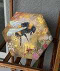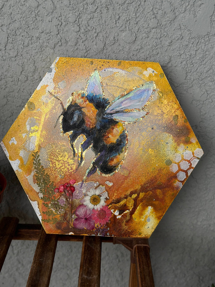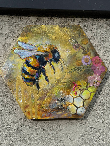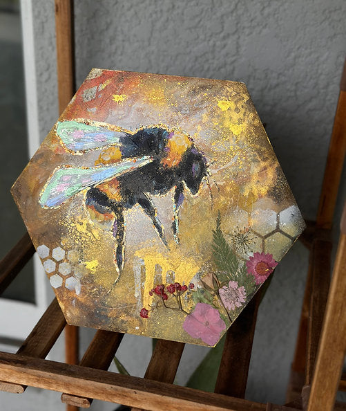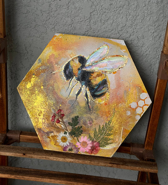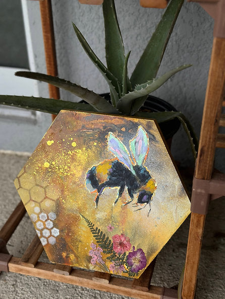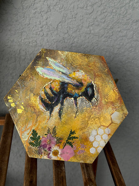 Set of 6 gorgeous originals one of a kind collectables. "Worker Bee Collection" is acrylic mixed media paintings on 8x8 hexagon canvas and is signed and stamped by emerging artist Michelle Green, owner of Mozzafiato Art. 100% Secured Purchases guaranteed.